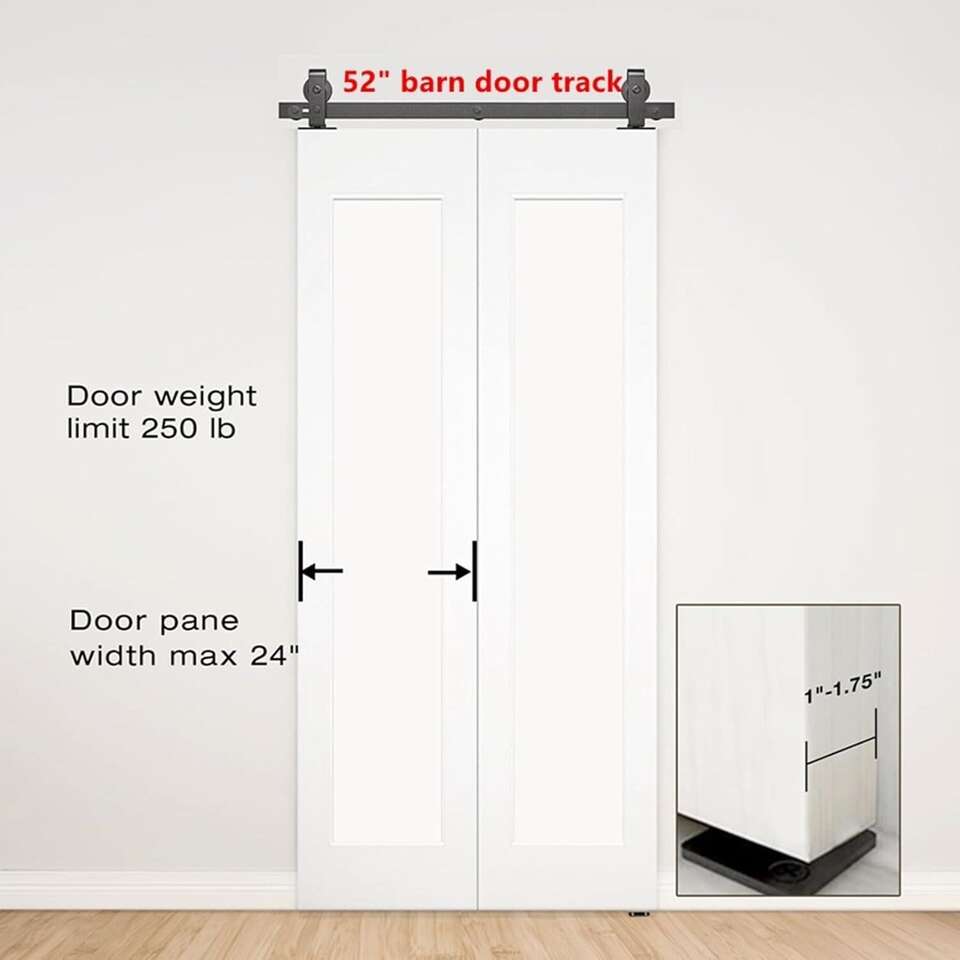 52 bifold barn door hardware kit fit door panel width max 2X24. Package include: barn door track1, roller and bracket2, track&wall connector 3, door hinge3, floor guide*1, screws, strip seal. All other necessary hardware is included as you see in the pictures.