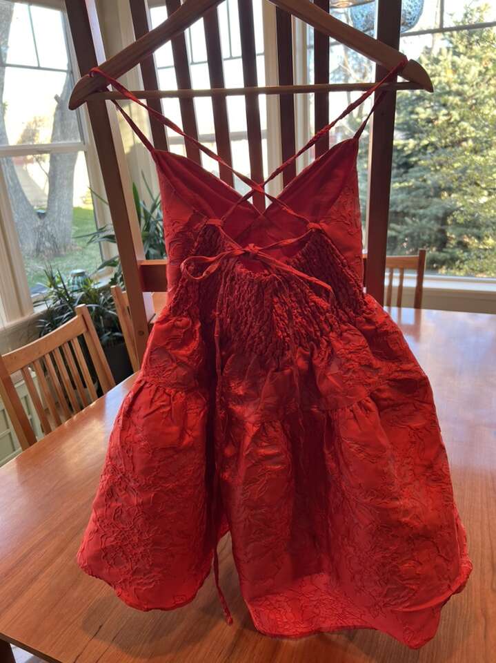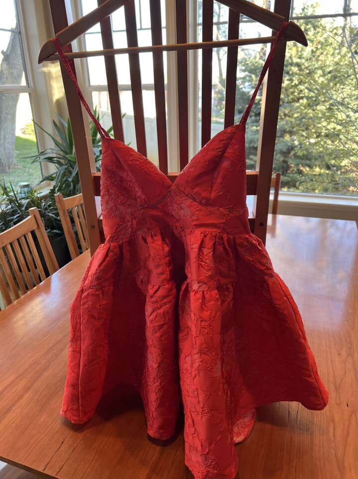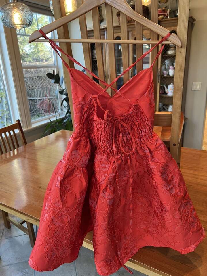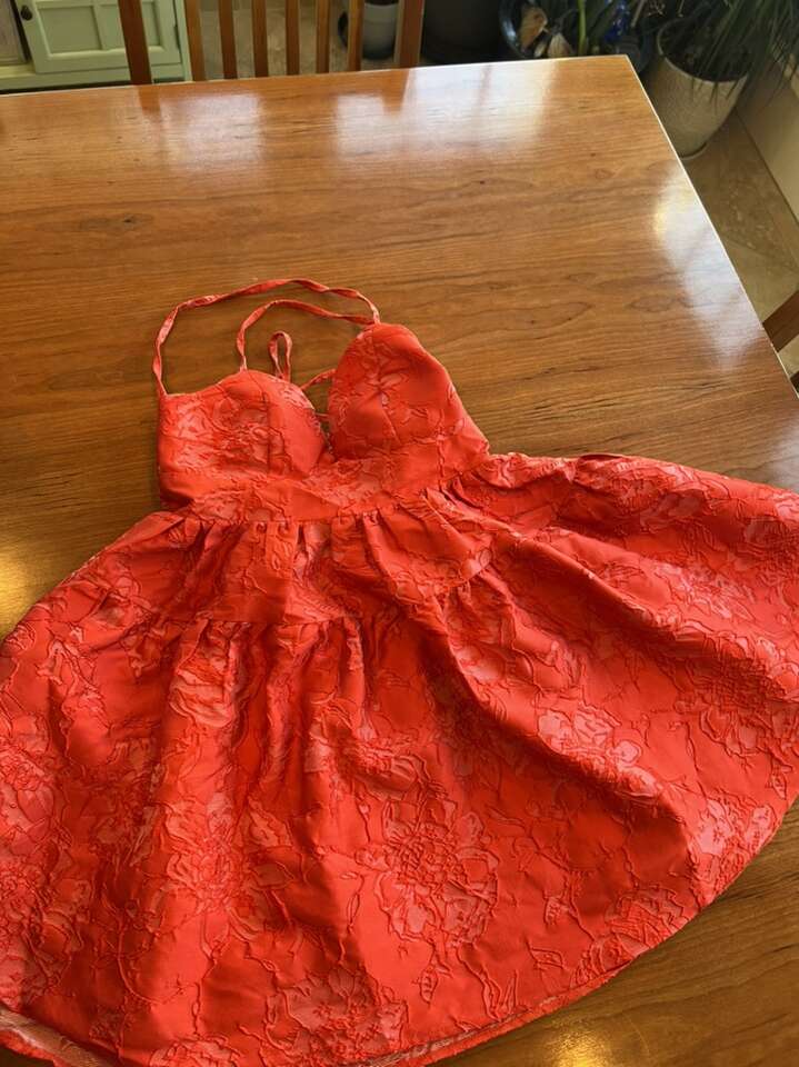 PayPalBeautiful little red dress. Worn once. Tried to capture fabric detail. Maybelle Jacquard A-line mini Dress bright red. Size small $45