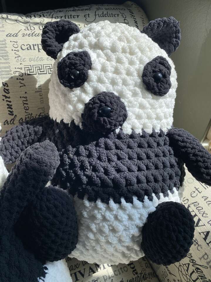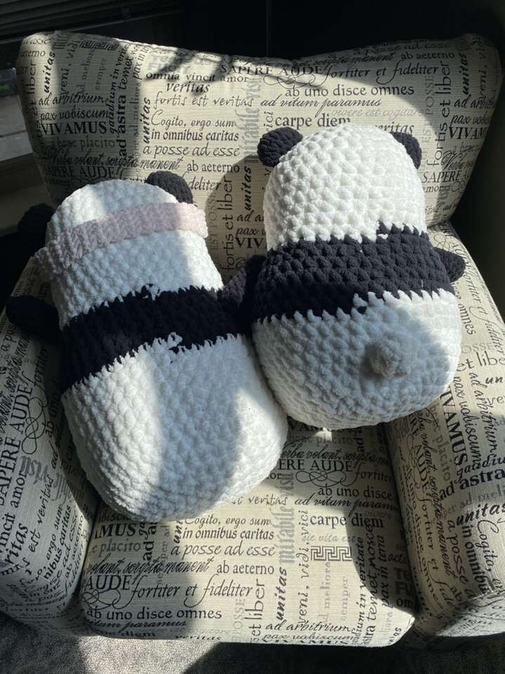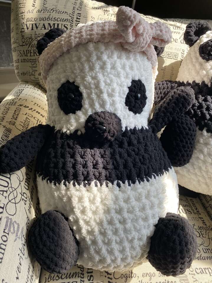 ZelleCrochet, stuffed animal panda bears. They are large and hand made so you can’t buy these in a store. Soft and fluffy, great for snuggling with. One comes with a removable bow. Must be sold together.