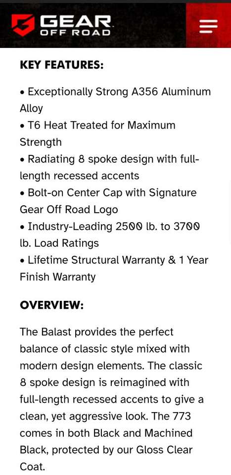 KEY FEATURES: • Exceptionally Strong A356 Aluminum Alloy • T6 Heat Treated for Maximum Strength • Radiating 8 spoke design with full-length recessed accents • Bolt-on Center Cap with Signature Gear Off Road Logo • Industry-Leading 2500 lb. to 3700 lb. Load Ratings • Lifetime Structural Warranty & 1 Year Finish Warranty