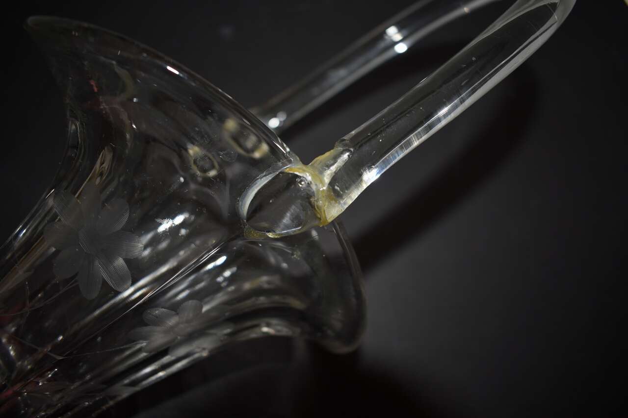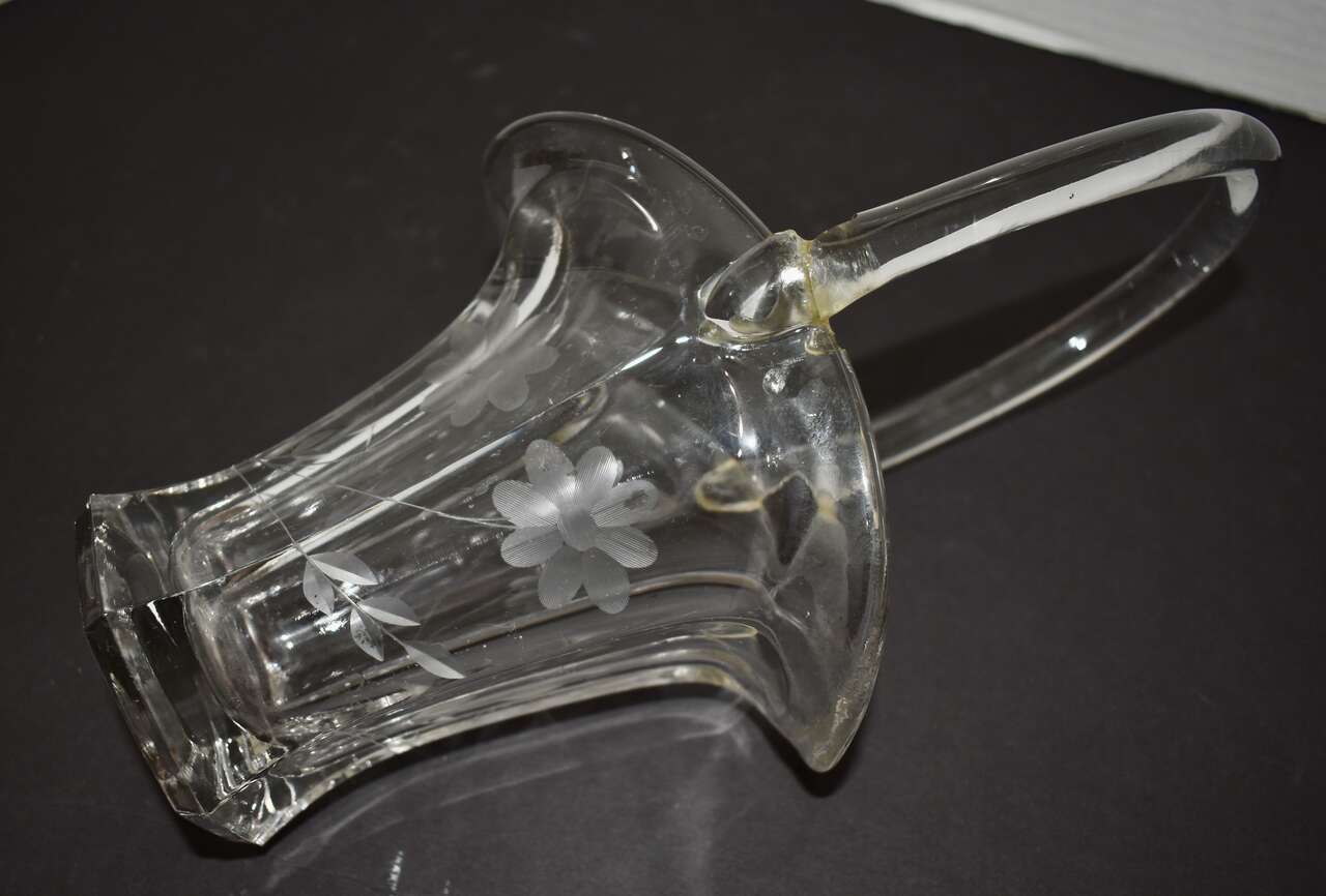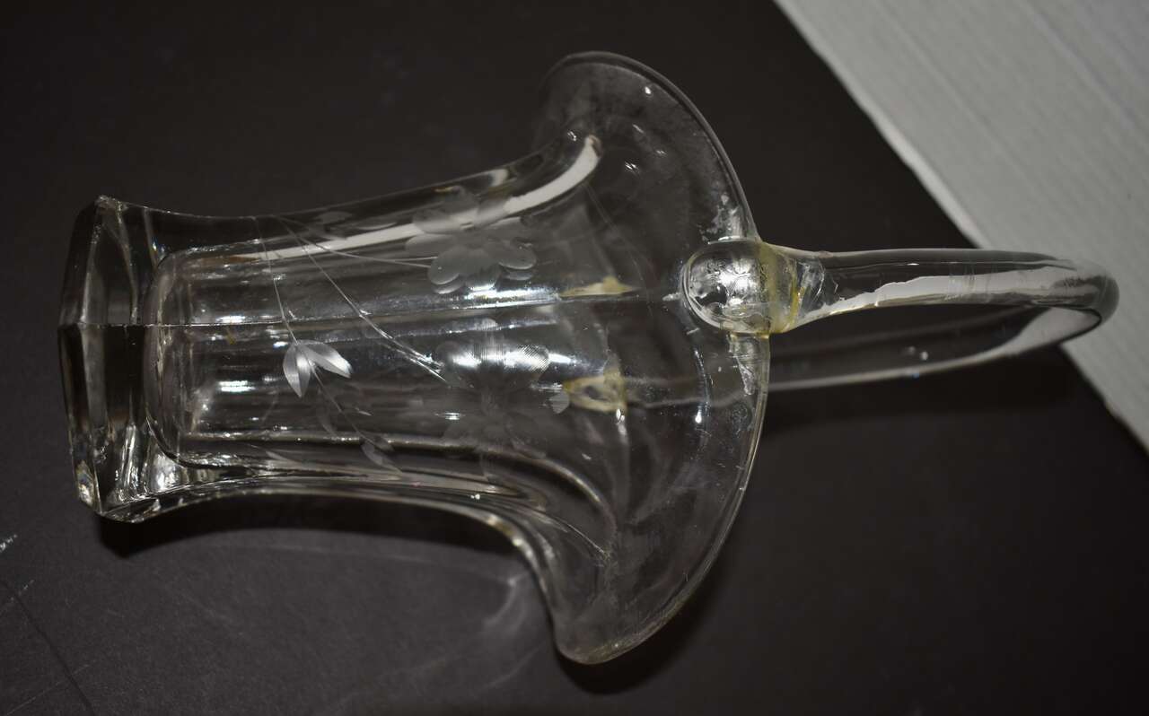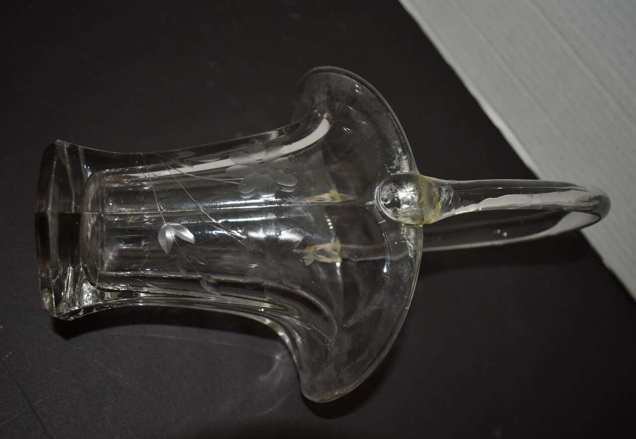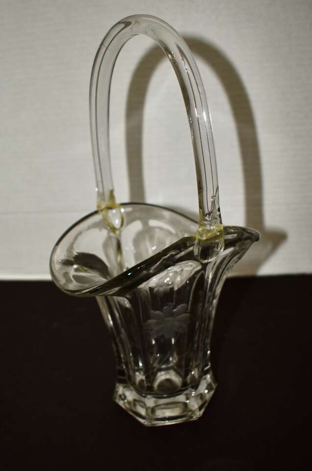 **IT MEASURES…**Approx. 11 inches from the bottom to the top of the handle area. It is 6 inches measured across at the top middle area of the vase - side to side. And it is 5 3/4 inches tall from the bottom to the top area of the opening of the vase handle area.