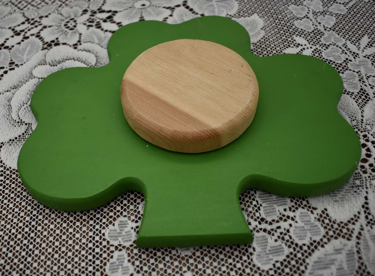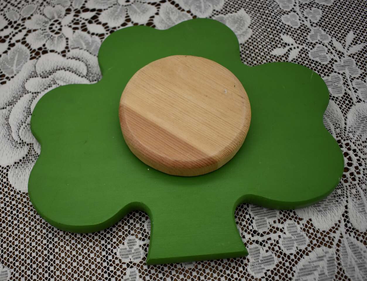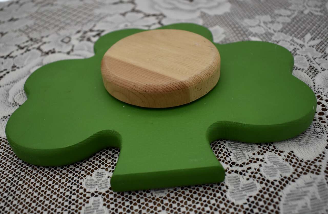 IT MEASURES… Approx. 9 1/2 inches across from side to side and it is approx. 8 1/4 inches for the top to the bottom area of the Painted Wooden Clover The wooden circle at the back measures approx. 3 3/4 inches across and it is approx. 3/4 inches thick.