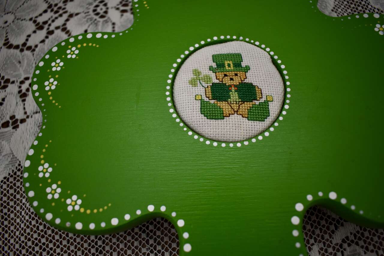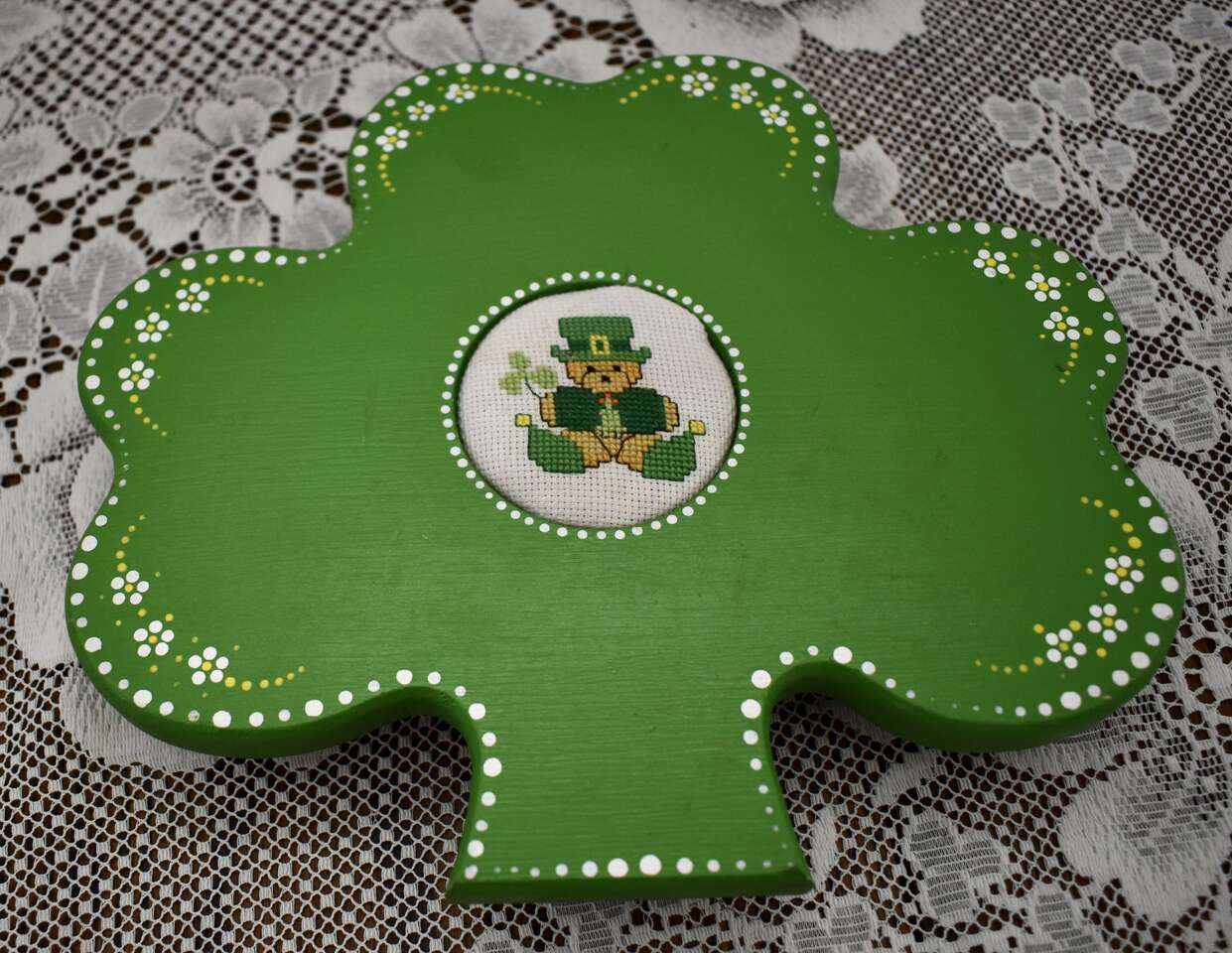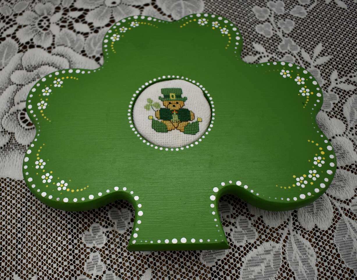 IT MEASURES… Approx. 9 1/2 inches across from side to side and it is approx. 8 1/4 inches for the top to the bottom area of the Painted Wooden Clover The wooden circle at the back measures approx. 3 3/4 inches across and it is approx. 3/4 inches thick.