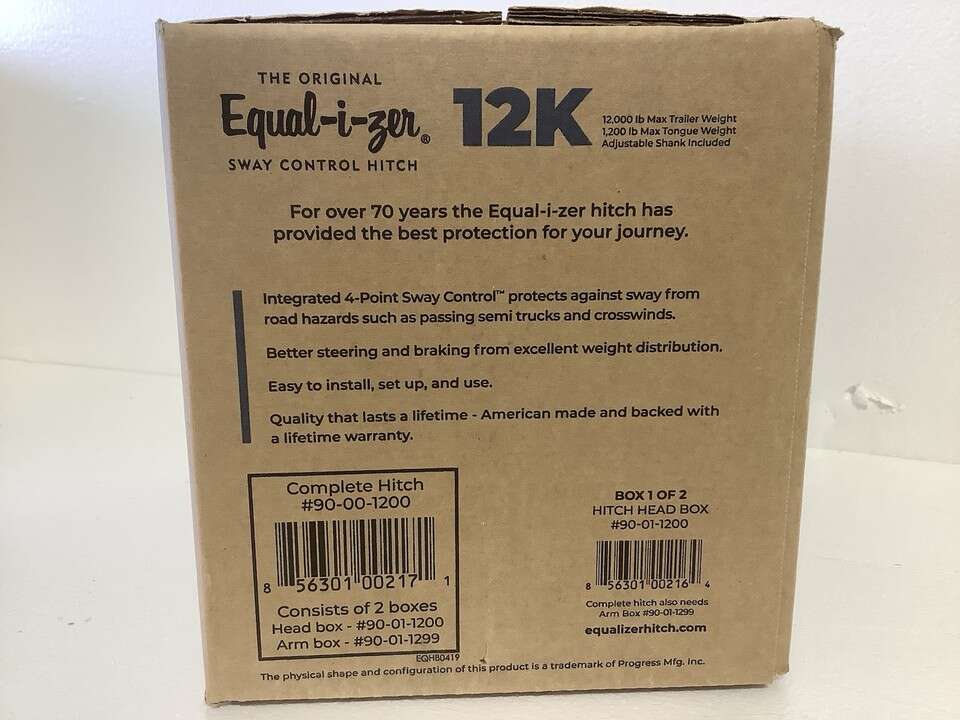 PayPalThe Equal-I-zer 90-00-1200 is a high-quality 4-point sway control hitch designed for trailers weighing up to 12,000 pounds. Made from durable alloy steel and painted in black, this hitch offers reliable weight distribution and control while towing. With a tongue weight capacity of 1200 pounds and a tow weight capacity of 12,000 pounds, this product is suitable for heavy-duty trailer needs. Manufactured in the United States, this hitch is a sturdy and dependable accessory for any vehicle needing to tow trailers safely and efficiently.
