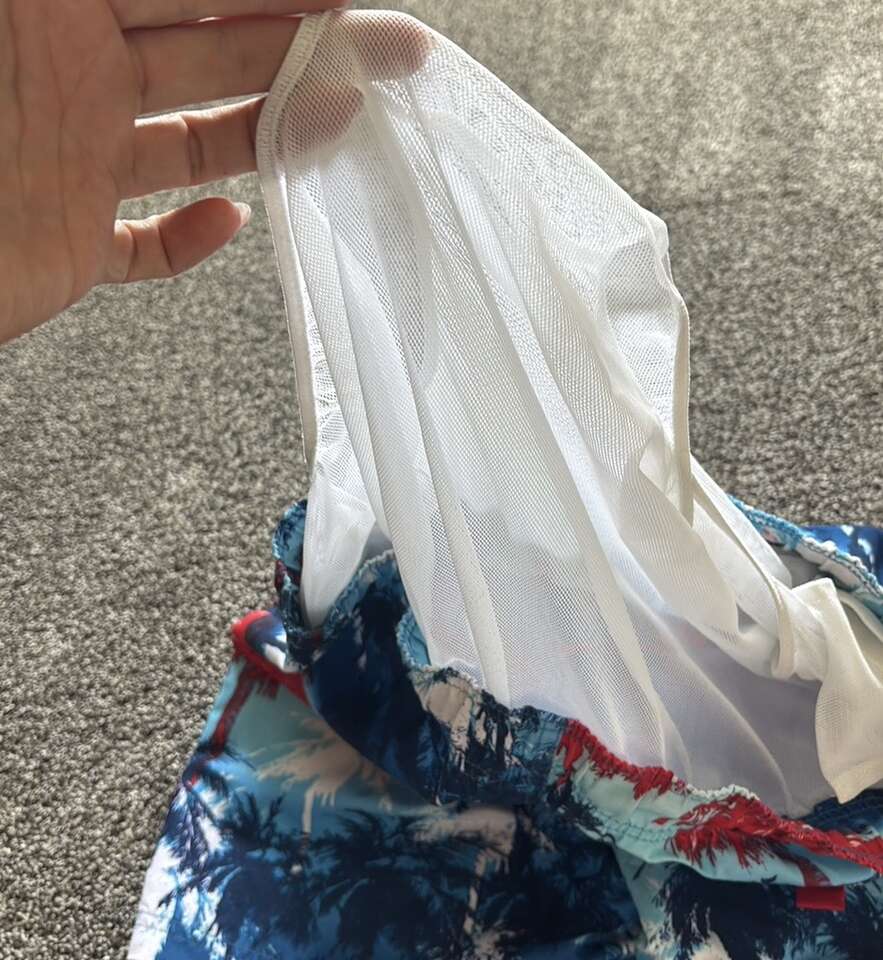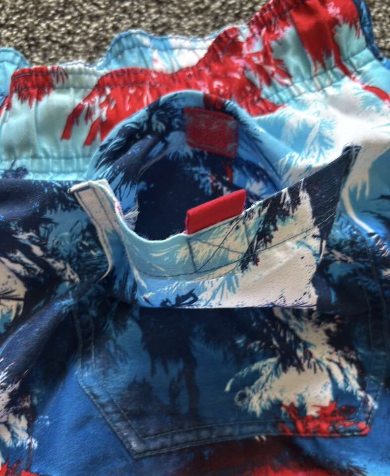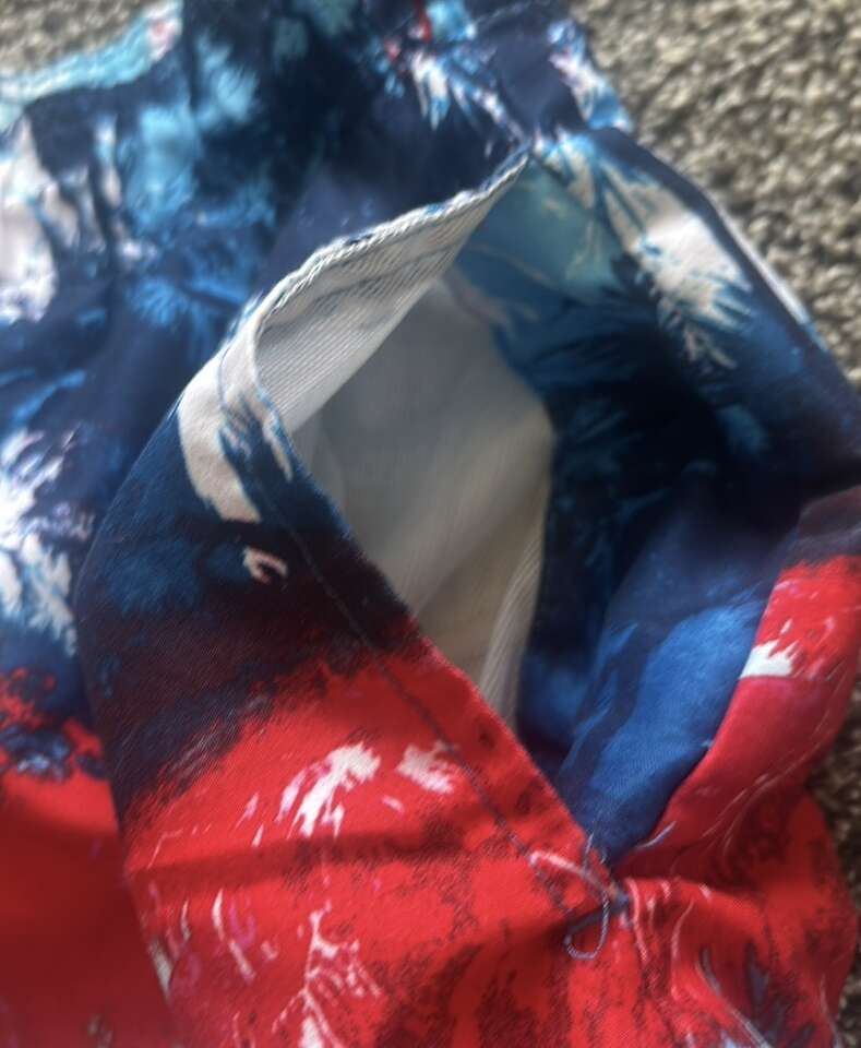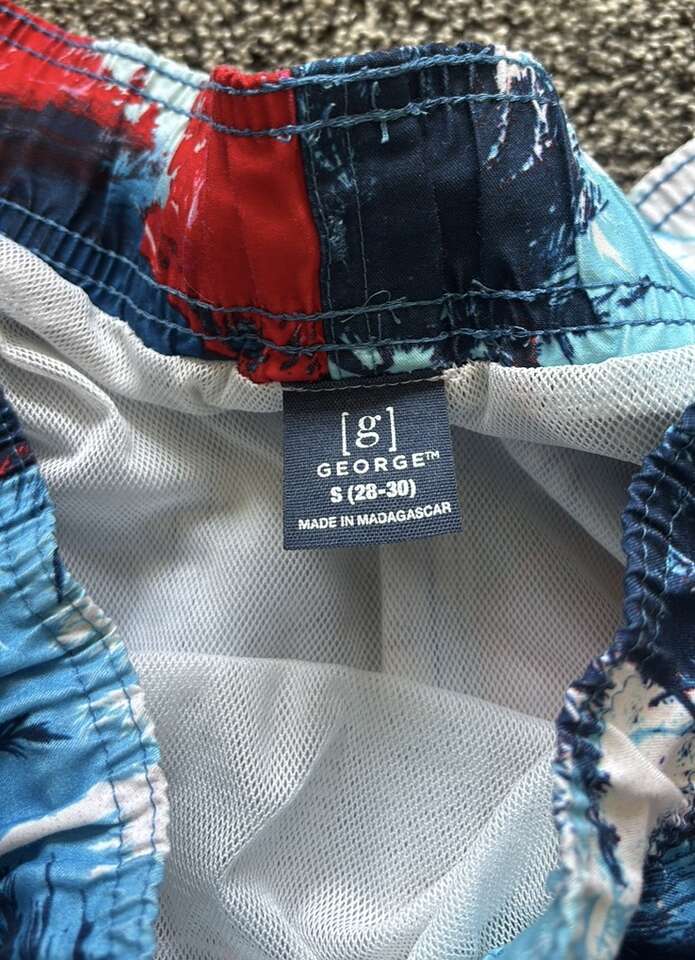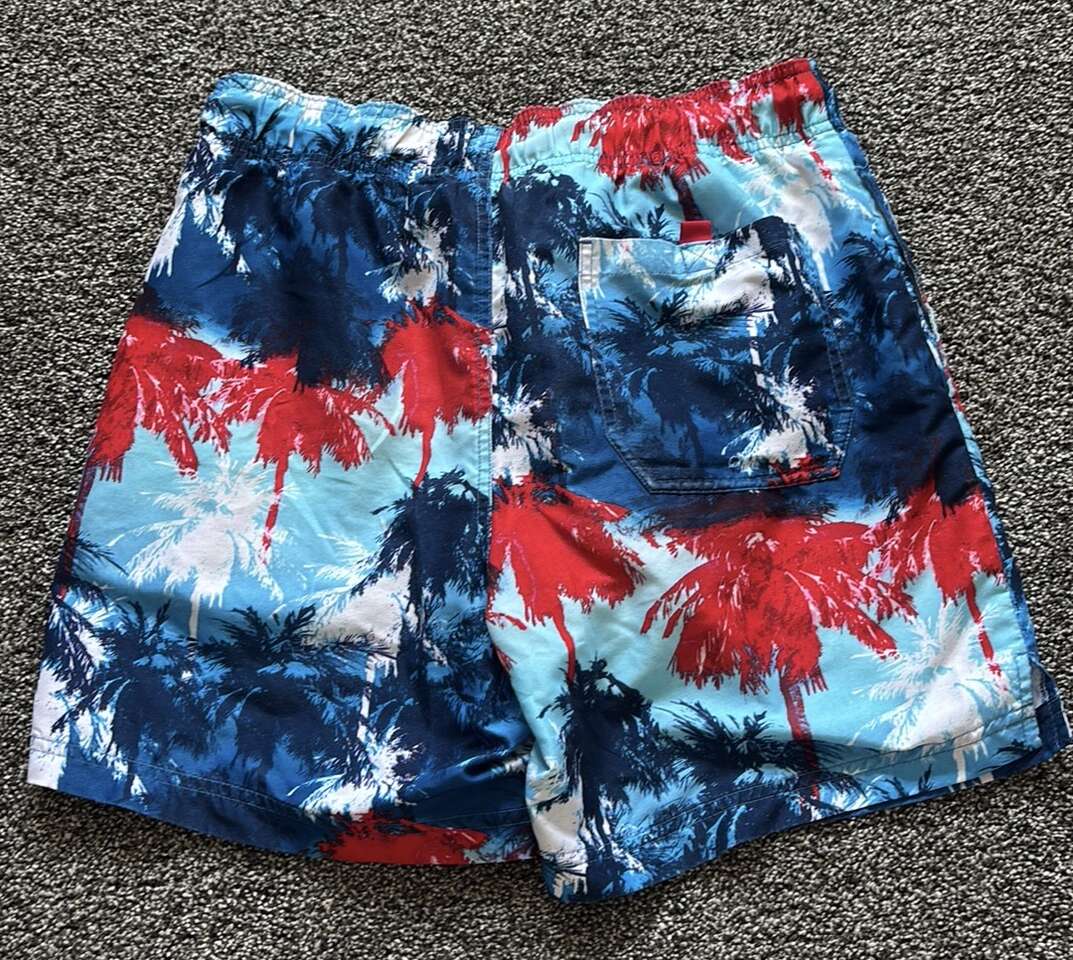 Red, white, and blue swim shorts in great condition in men's size small. Has adjustable waistband, pockets, and mesh lining. Smoke-free, pet-free home. $10, cash only please.