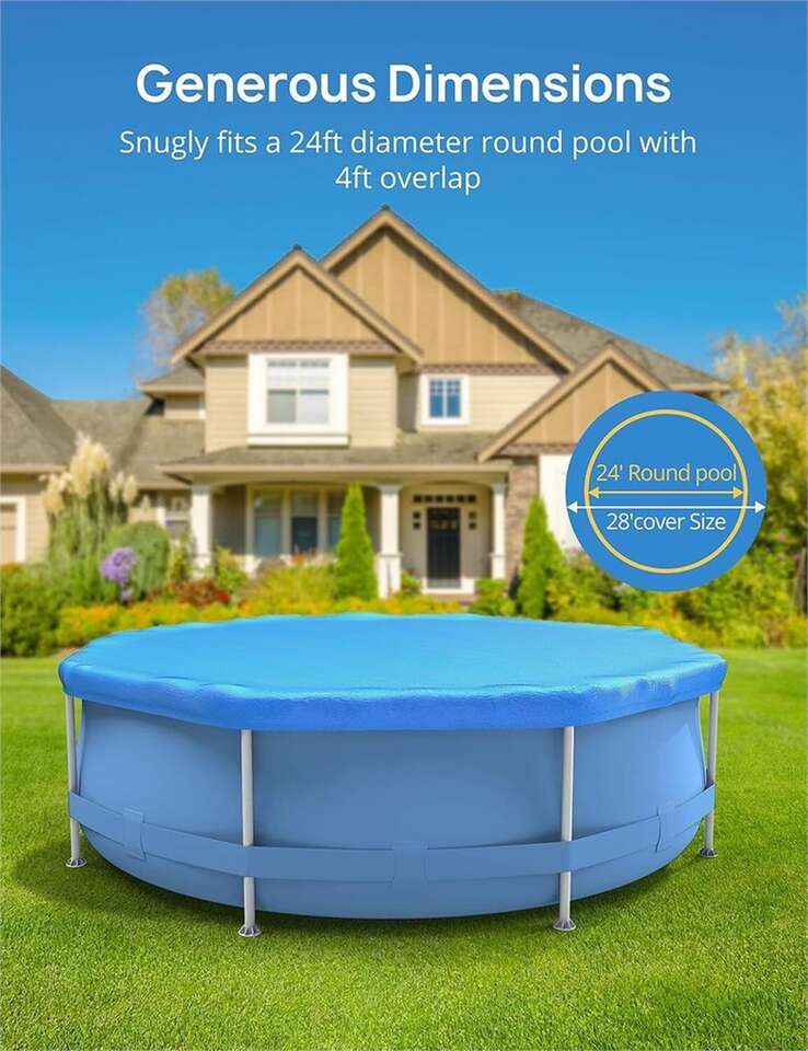 Generous Dimensions: The large 28ft dimension of this EVAJOY pool cover perfectly accommodates round inflatable swimming pools with a diameter up to 24ft. The cover features a 4ft wide overlap which can accommodate most top rails and prevents tearing and wear during the winter months.