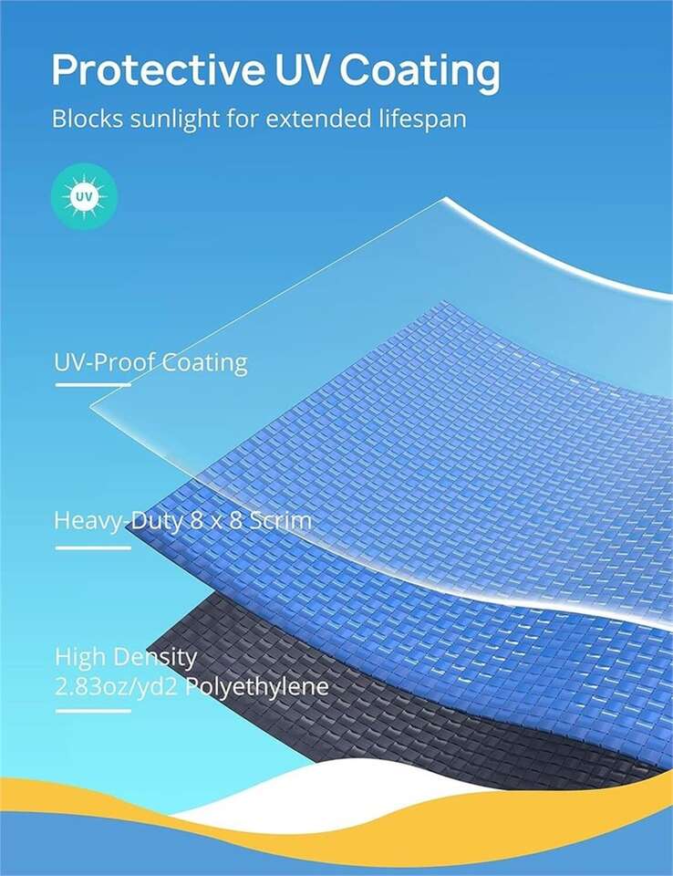 Robust UV Coated Protection: Engineered from 2.83oz/yd polyethylene material, this winter pool cover features a durable 8 x 8 scrim with UV-proof coating that protects your pool from sunlight, snow, ice, and wind as well as keeping unwanted debris out of the pool.