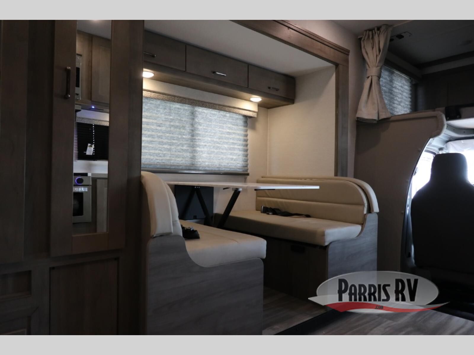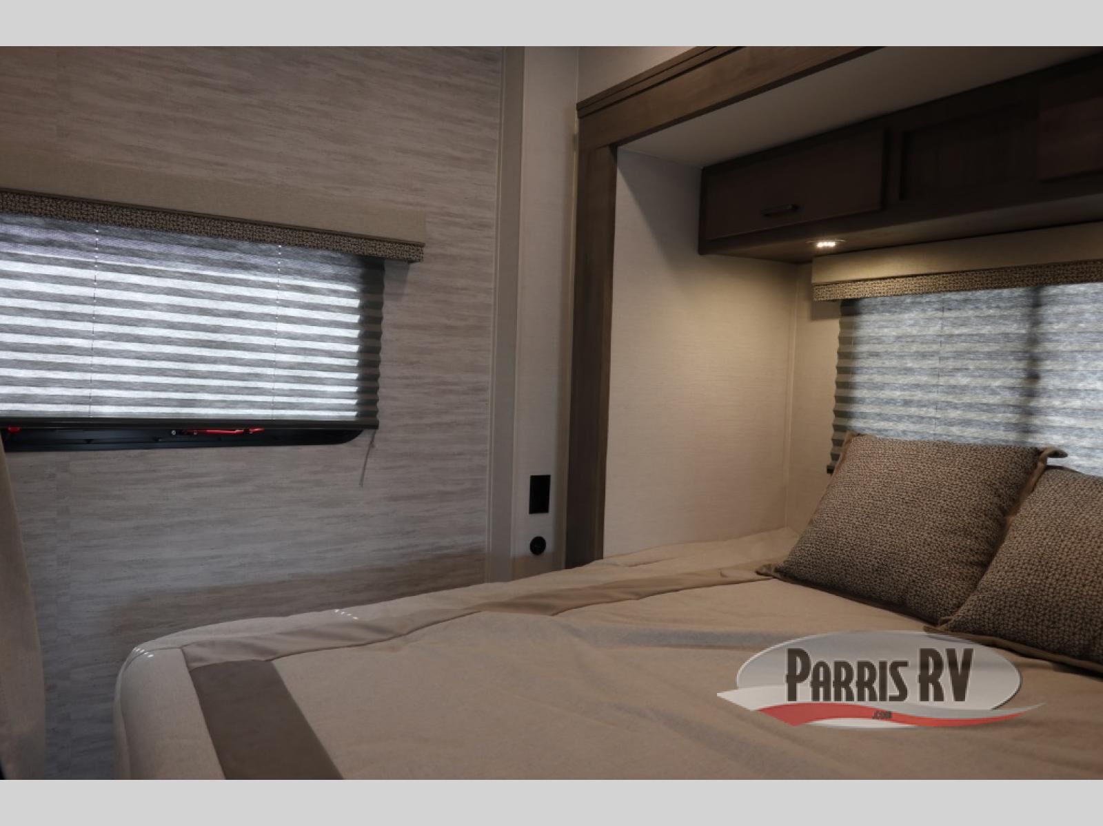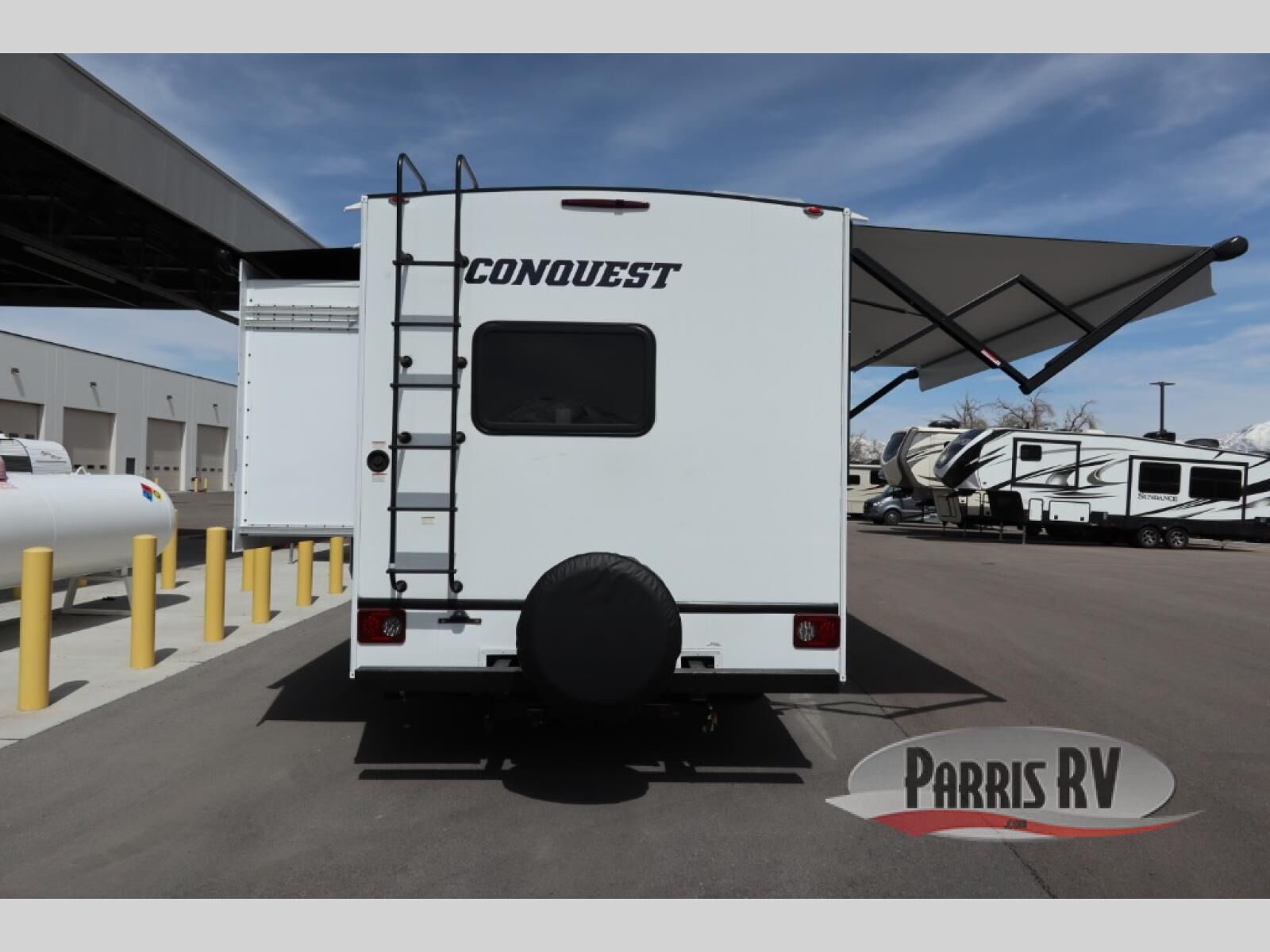 Imagine lots of floor space once the full-wall slide is set up in this Conquest Class C gas motorhome. You can easily walk from the front cab area with an overhead bunk to the rear corner bathroom or RV queen bed. The cook will love the kitchen amenities, like a pantry to store plenty of food, a three-burner range to cook your meals, and a double-door 12V refrigerator/freezer to store any leftovers. You can probably imagine dining inside on those rainy days at the booth dinette and staying outside under the electric awning in your camp chairs the rest of the time.