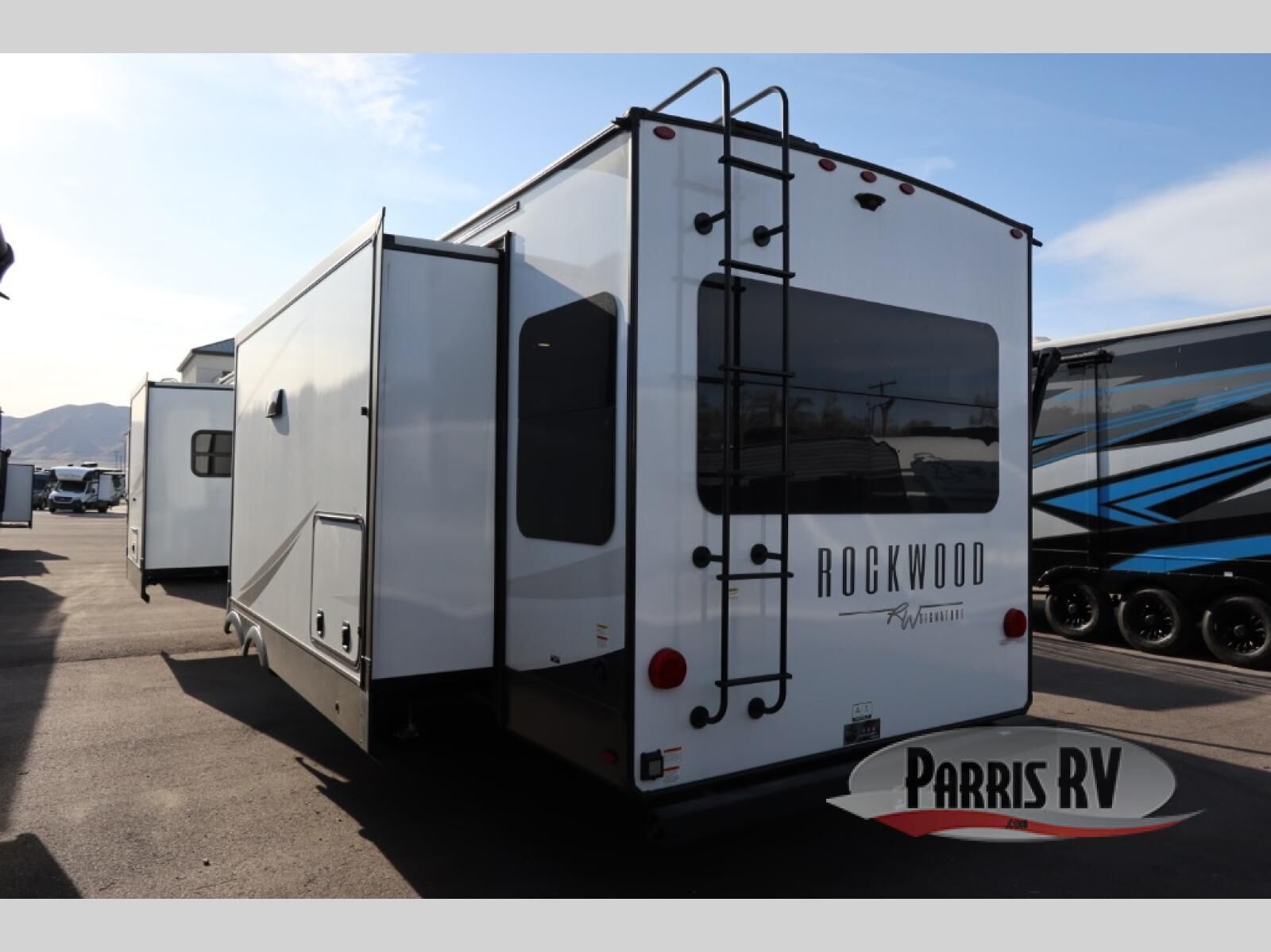 With any Rockwood Signature fifth wheel or travel trailer by Forest River RV, you will enjoy superior construction that includes laminated white fiberglass sidewalls, a radius roof with vaulted interior ceilings, plus radiant foil insulation and an enclosed underbelly for use in all types of weather. Some convenient exterior features include Keyed Alike locks, a rear ladder, a 200W solar panel, and a tire pressure monitor system with a monitor for added safety. The interior offers a One Touch OneControl panel with WeRV app control, for lights, awning, slides, water heater and more, and the Air 360+ omnidirectional antenna with WiFi prep lets you work while away from home if needed. You will also appreciate the interior vaulted ceilings, residential soft close doors and drawers, solid surface kitchen countertops, and designer kitchen backsplash!