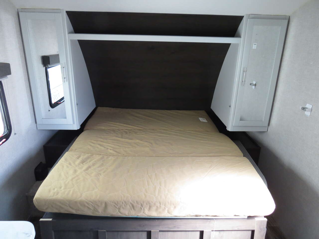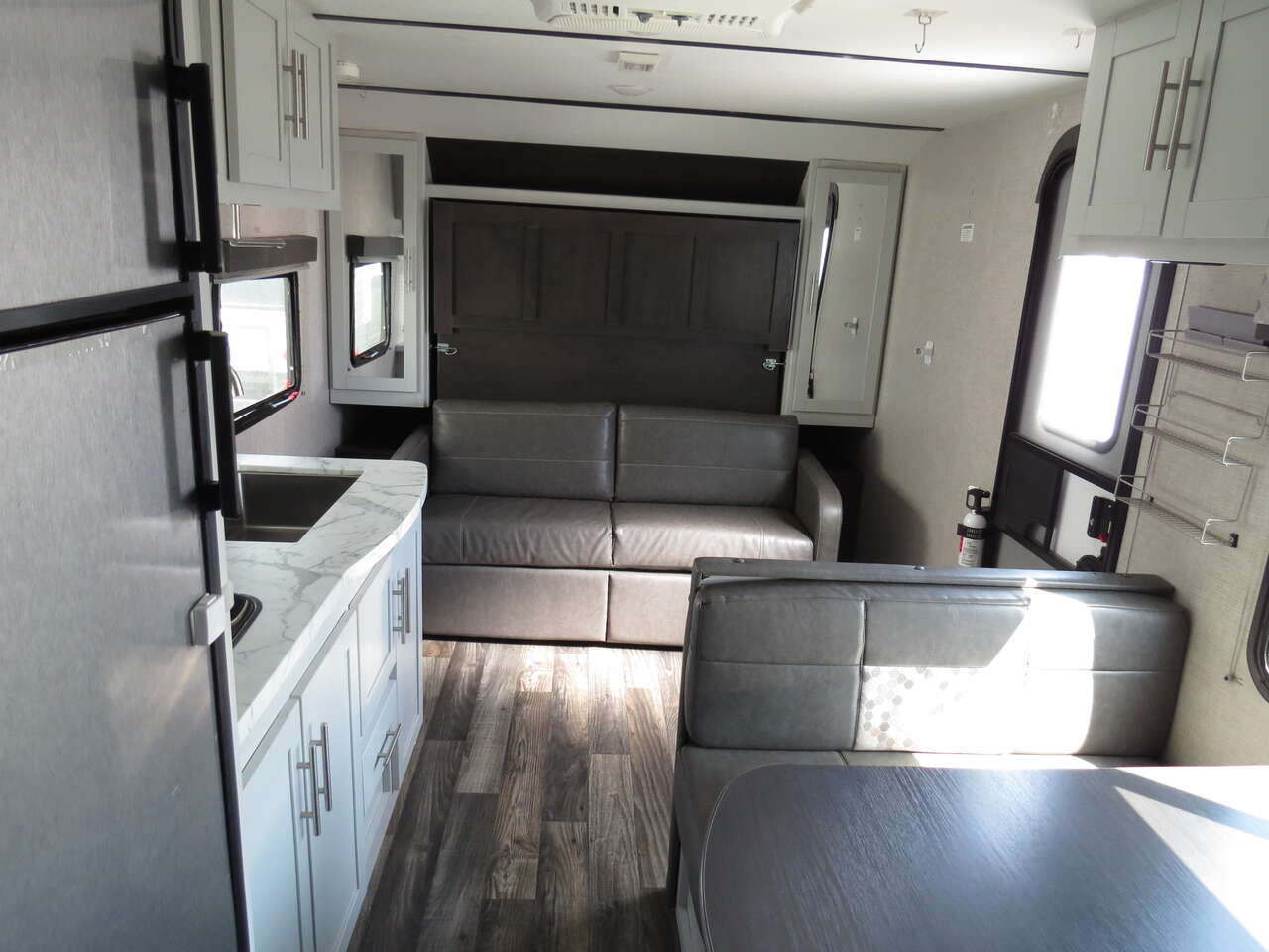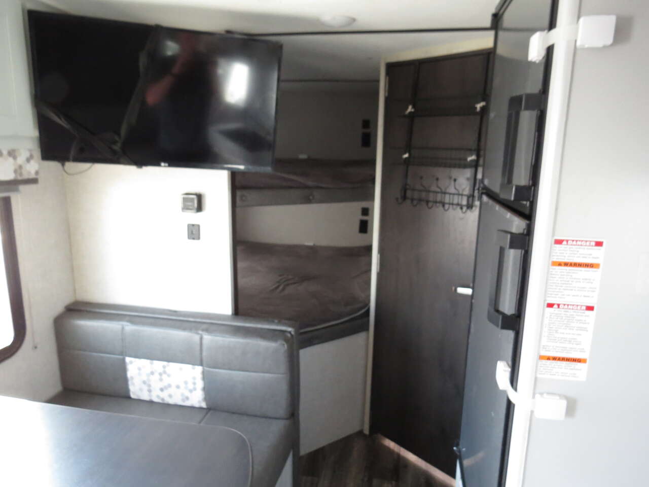 2 Big Rear Bunks, Front Murphy Bed, Booth Dinette, side Kitchen Full Size Fridge, Corner Bathroom, Dinette Makes down to bed, A/C unit and Heat.