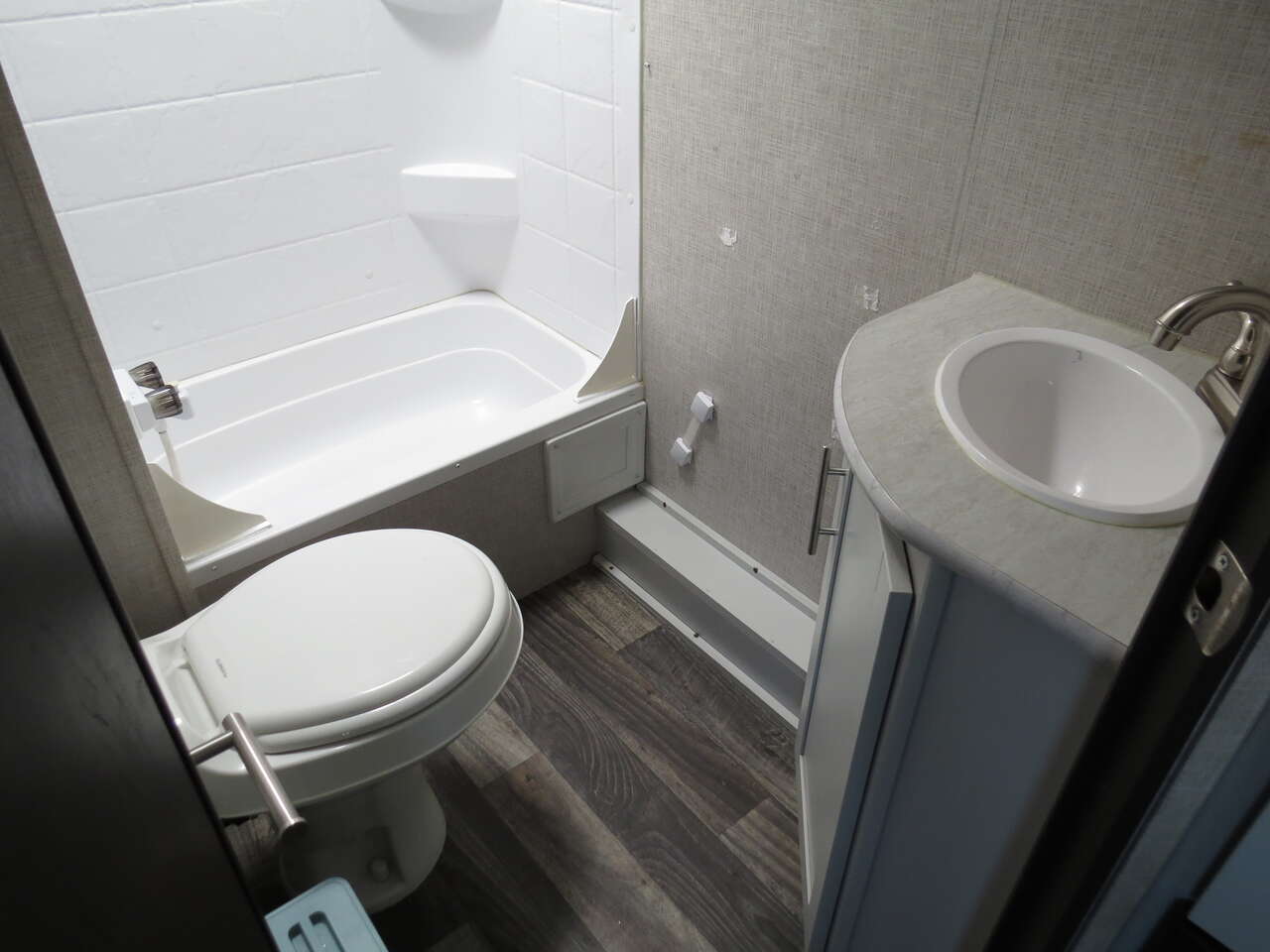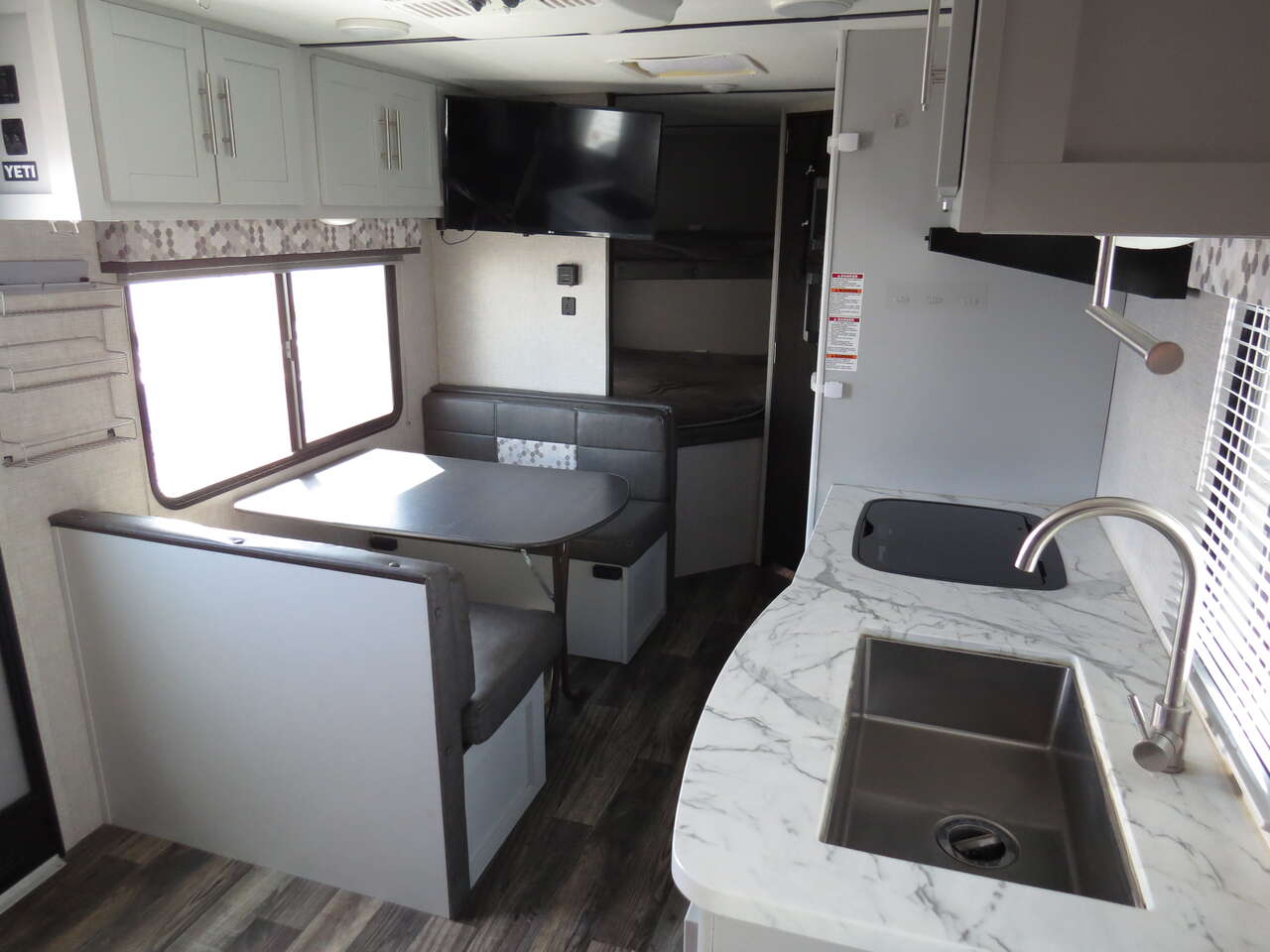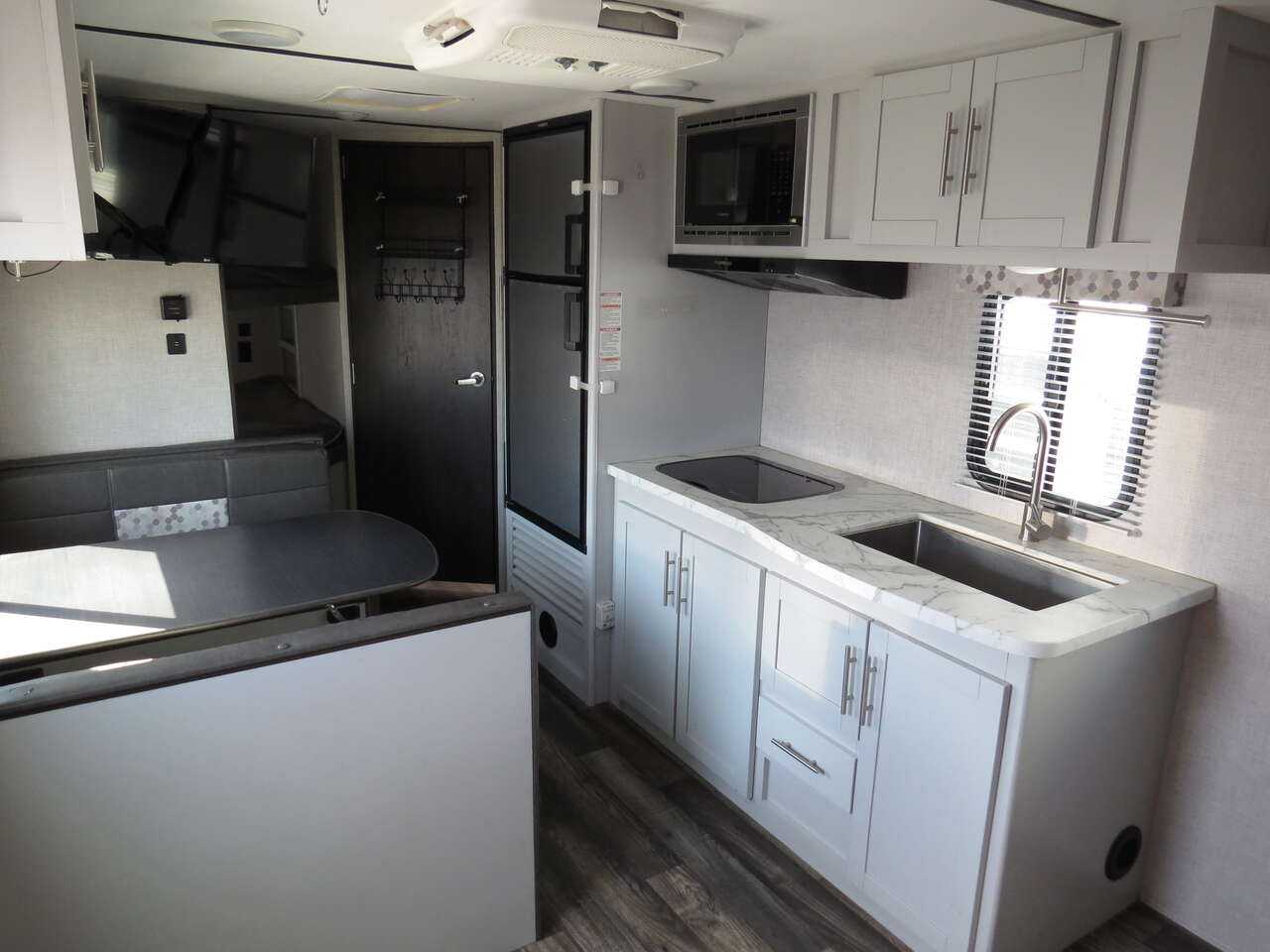 2 Big Rear Bunks, Front Murphy Bed, Booth Dinette, side Kitchen Full Size Fridge, Corner Bathroom, Dinette Makes down to bed, A/C unit and Heat.