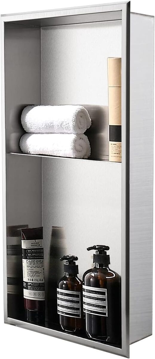 NEW IN BOX - Retail was $140 plus Tax DAYONE Stainless Steel Shower Niche 12 X 24 No Tile Needed Wall Niche Double Shelves Niche for Bathroom Storage Satin Nickel Superior-Quality Material: Made from SUS304 stainless steel. Waterproof, corrosion-proof, rust-proof and durable, far superior to XPS foam, lightweight plastic or fiberglass mesh. It can be used for up to 10 years and costs only 0.051 per day on average. It looks expensive, but it's actually a great deal More Storage space, Takes up Less Space: Our rectangular shower niche are built-in design, and the double-layered storage compartments provide you with plenty of storage space. You can store everything you need in your bathroom in one place. More neat and orderly. Say goodbye to the hassle of finding things in every cabinet Make It Your Own: Our 12×24inches shower niche can be installed at the angle that best suits your needs. No Tile Need, what you need is all in the Box! Just need to cut the right size on the wall according to the dimensions. Take full reign of your creative liberty when remodeling your shower Modern Design: DAYONE stainless steel shower niche with brushed nickel finish and integrated drip slope. The water will drain quickly and just clean with a wet cloth. In addition to its stylish and beautiful features, matching the decor of your home. It is the faithful partner of millions of families