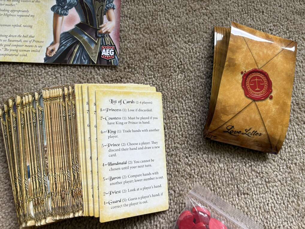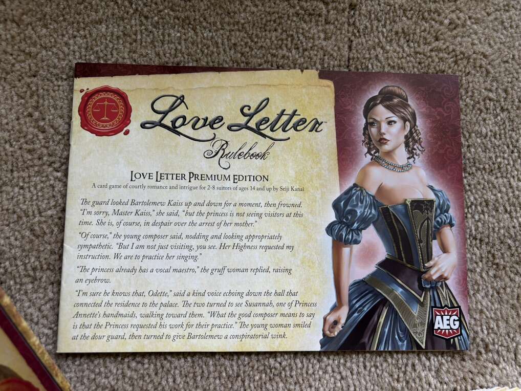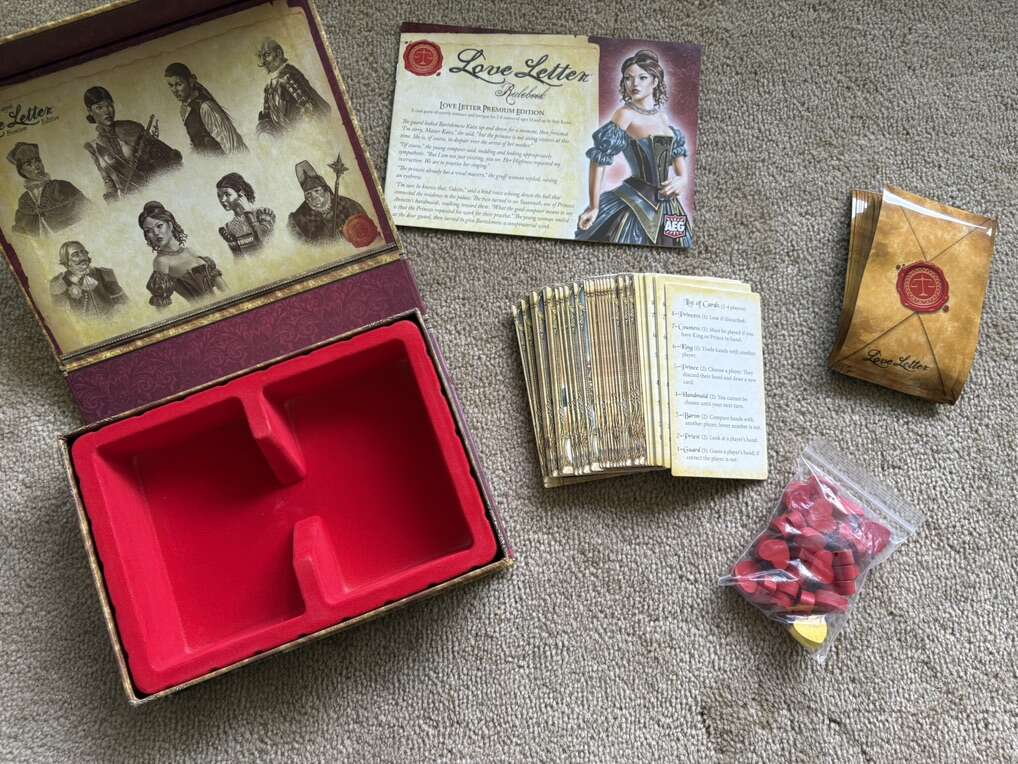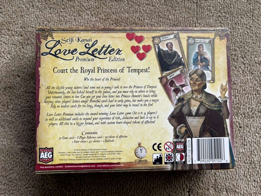 COMPLETE Seiji Kanai Love Letter card game: Premium Edition. Court the Royal Princess of Tempest! Expanded, improved version of the original. Rare, hard to find game. AEG, 2016. Age 14+, 2-8 players. Complete, no missing pieces. Excellent condition. Text only. Cash or Venmo.