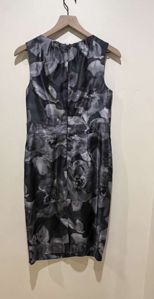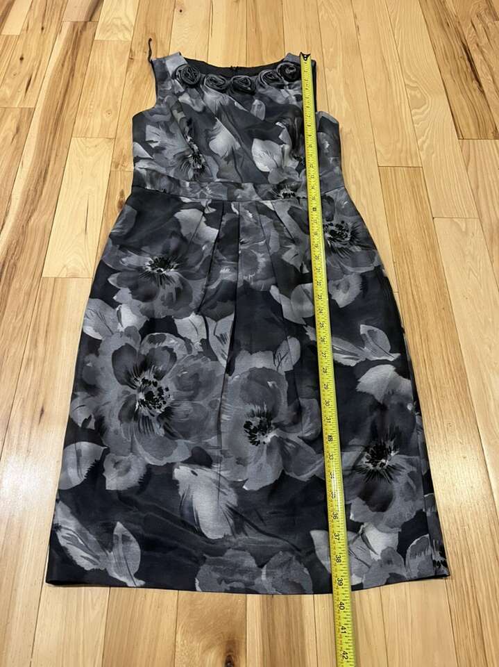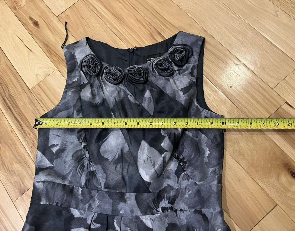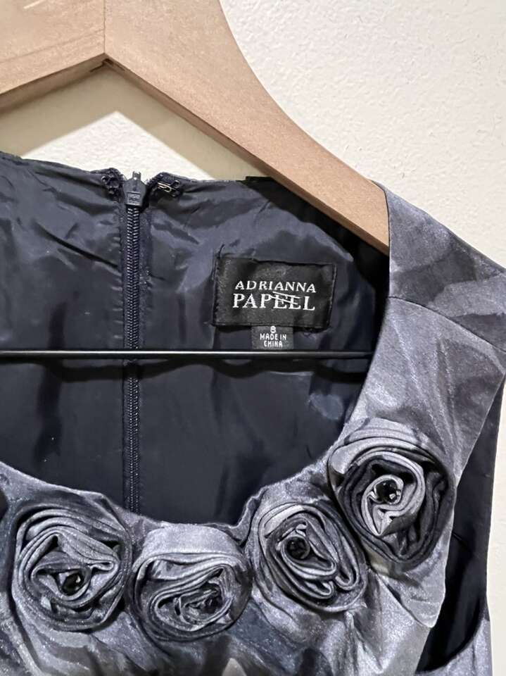 Adrianna Papell Gray (almost a steel blue grey color) Floral Sleeveless Dress with Rosettes at the Neck Line - Women’s Size 8 - with pleated front for slimming look - pre-owned, great condition.