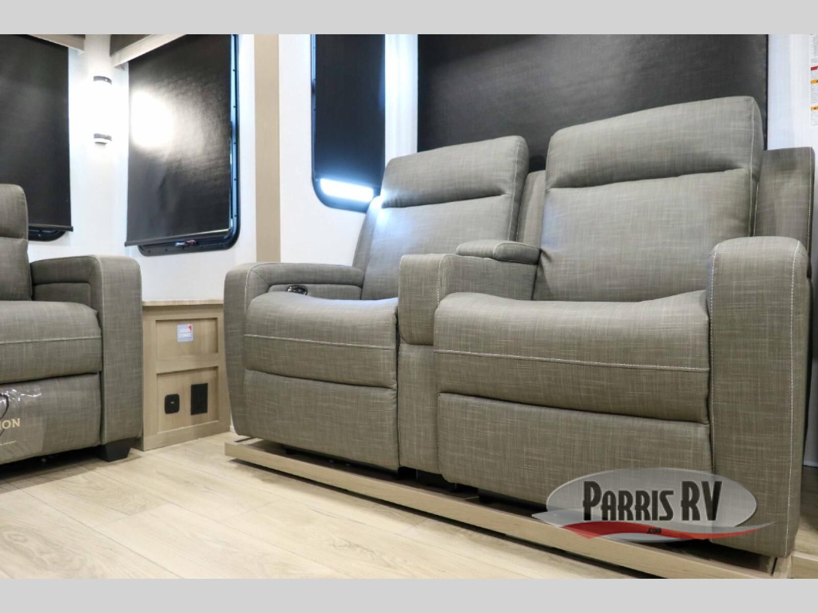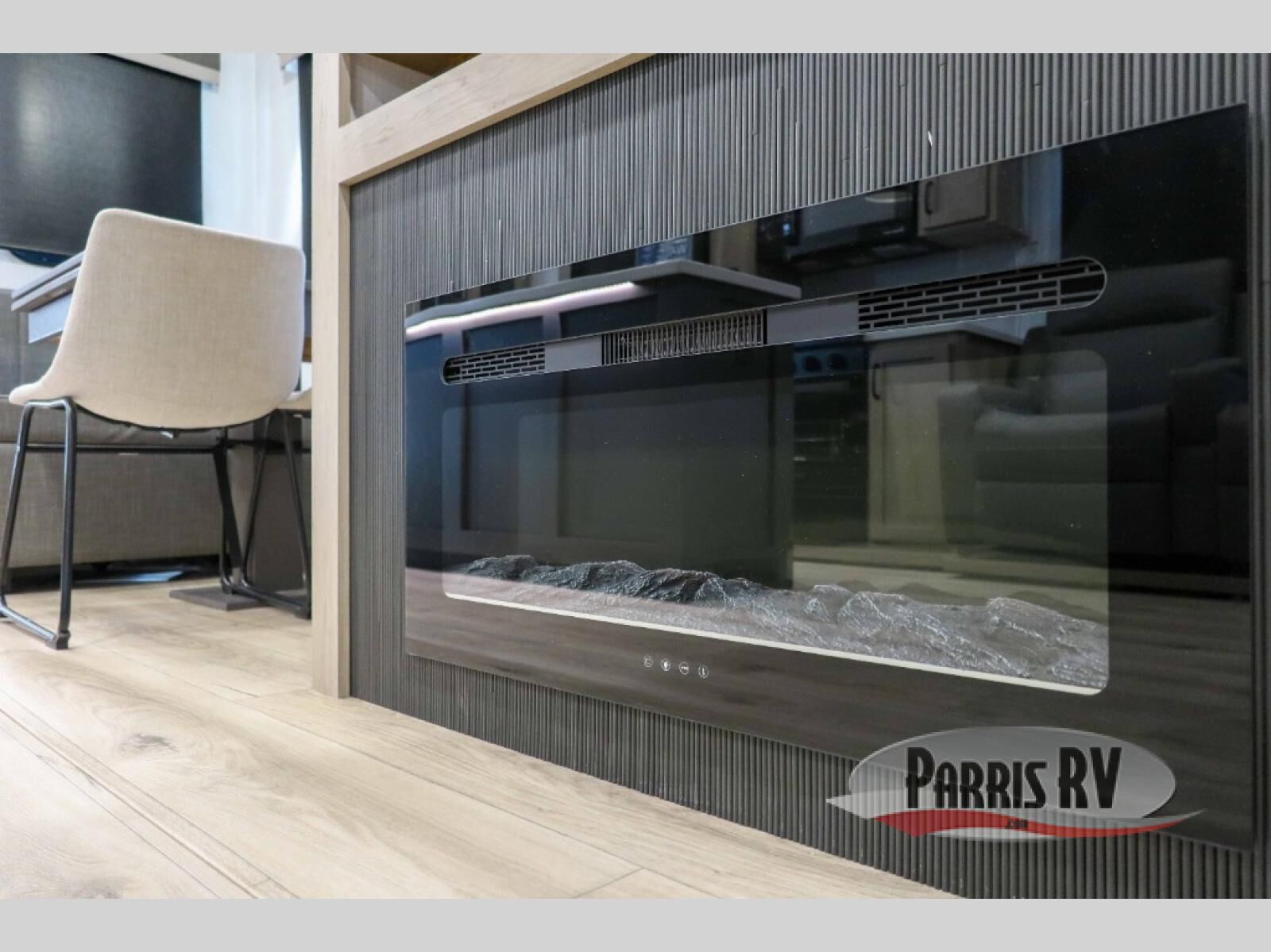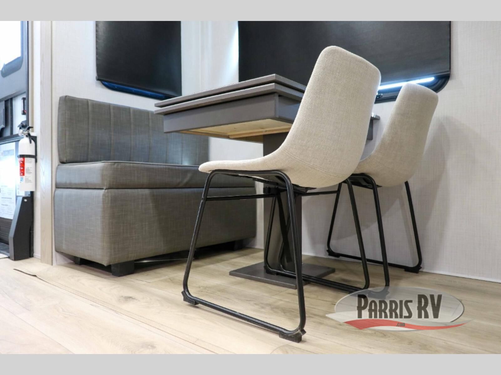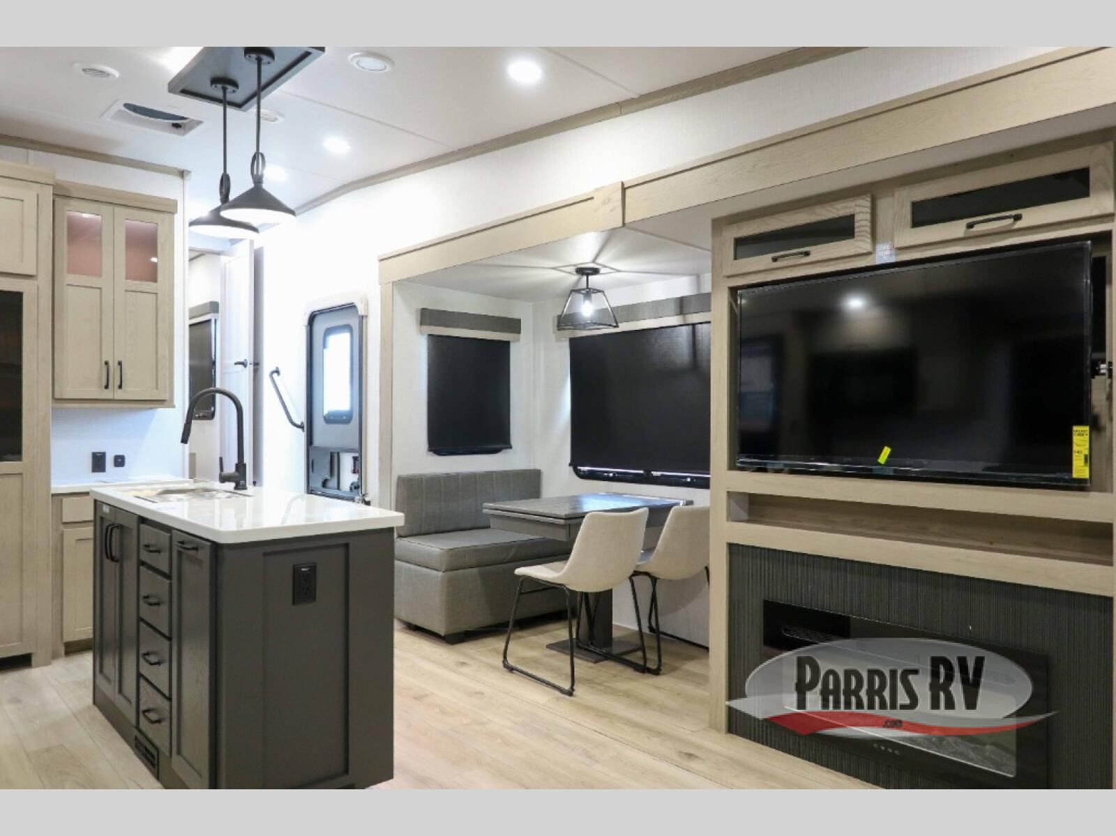 You'll be camping in style each time you take this fifth wheel out to the campground! The dual opposing slides in the main living area create an open floorplan, and the kitchen island here will provide more counter space to prep meals. You will love the theater seat directly across from the entertainment center and fireplace, and additional seating can be found on the hide-a-bed sofa or the dinette with chairs and a bench. The full bath includes a shower with a seat, a skylight, plus a Maxxair ventilation fan to keep everything fresh. The front private bedroom may feel more like a resort with its king bed slide out, large wardrobe and shirt closet, plus a dresser to keep your clothes tidy. And did we mention this fifth wheel has two power awnings for maximum protection against the elements, and tons of exterior storage for all your gear!?