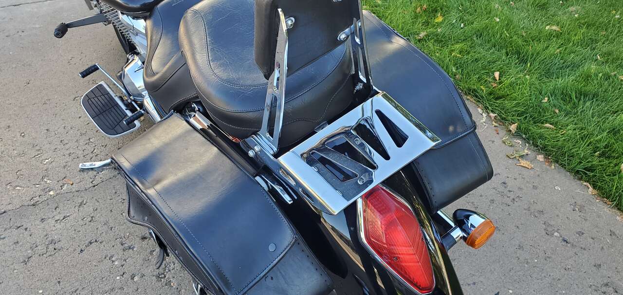 Upgrades include Vance & Hines Pipes, Mustang seats, K&N air filter, sissy bar, luggage rack, Dynojet Power Commander 3, saddle bags, quick-remove windshield, and highway pegs.