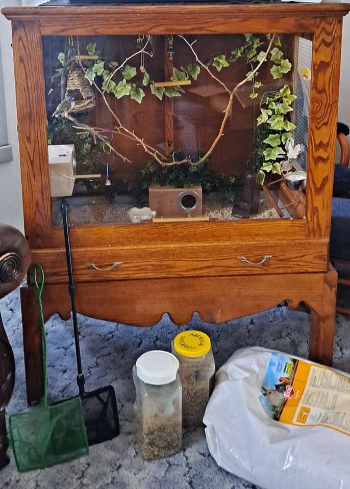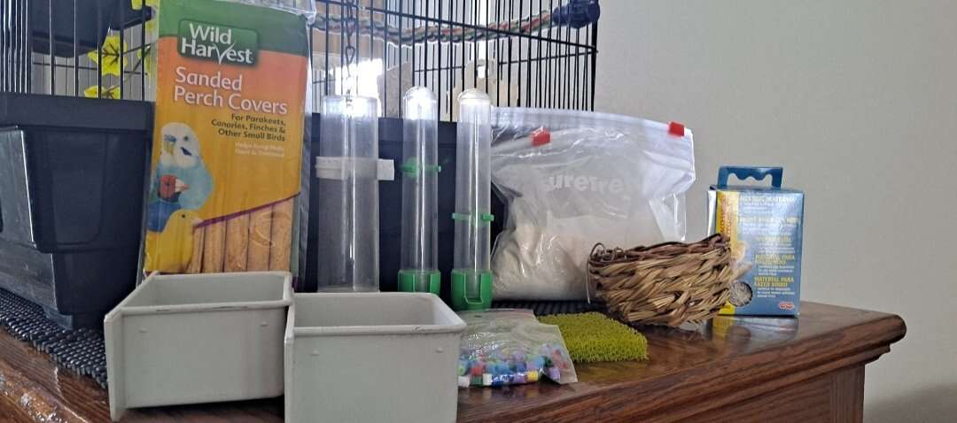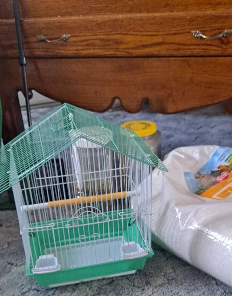 Comes with many Bird Accessories Bird nesting boxes and nests, swings, perches. Toys, 2 bird nets. Bird food dishes, bird water containers, and dishes for food and grit. Cuddle bones, Cob bedding, nesting materials. Smaller transporting bird cage, greenering, And all the rest of my pet supplies