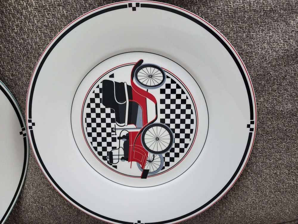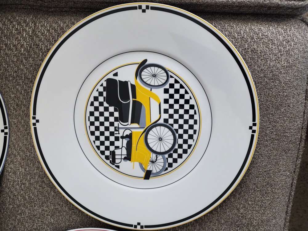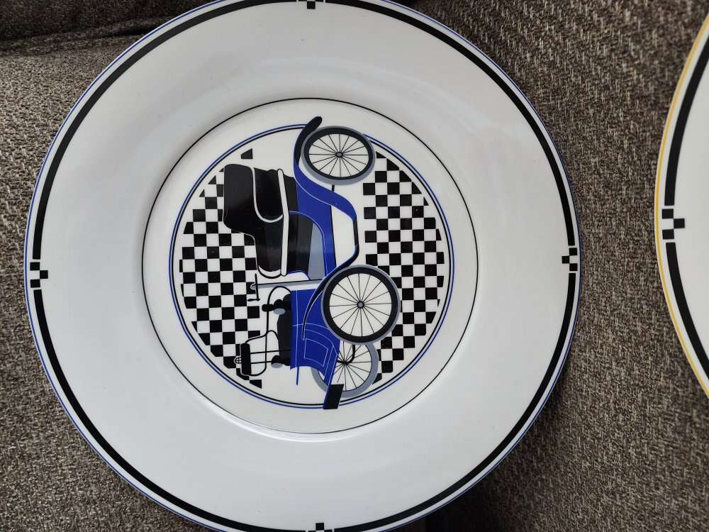 Red, blue, yellow and green 12" chop/charger plates. Super strong fine china, made in Japan 1980s 1990s. The blue has a couple of scratches, all in very nice but not perfect condition. Price for set.