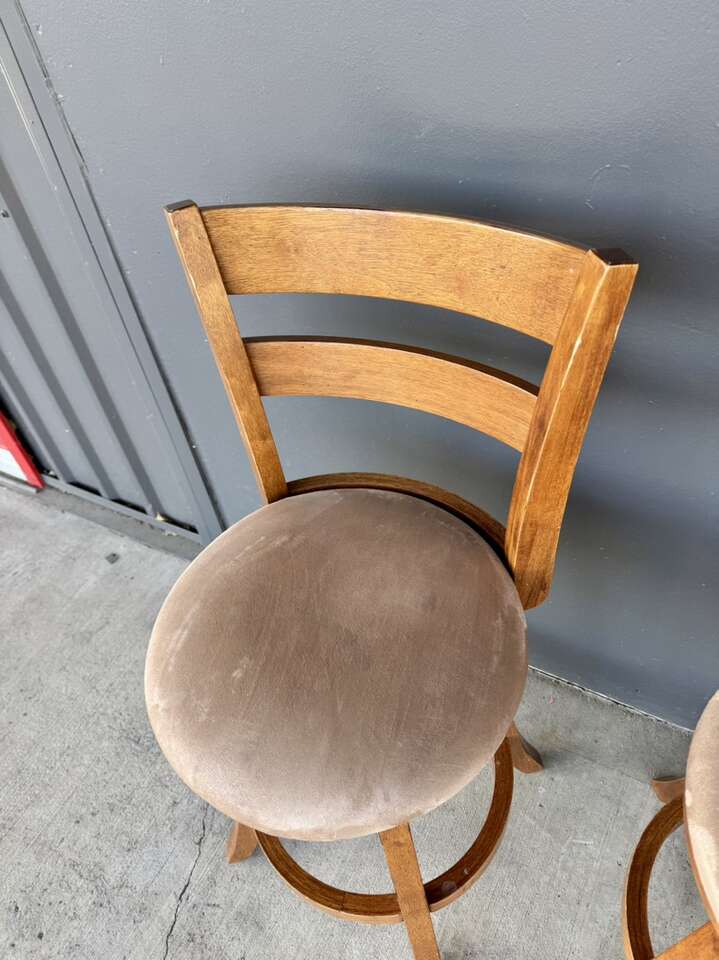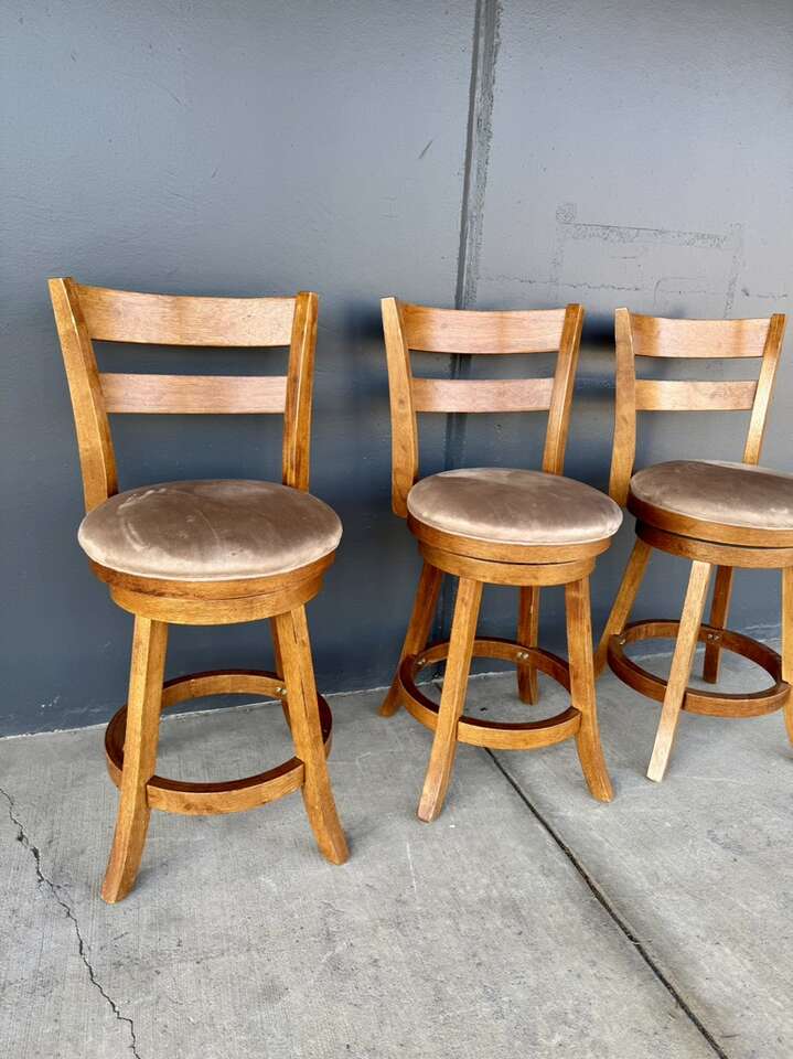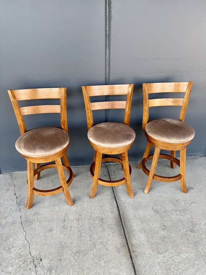 PayPalThere vintage solid wood barstools that swivel and have soft pink cushions. The upholstery needs to be cleaned in some places, but otherwise these are in good condition. Lovely and solid.