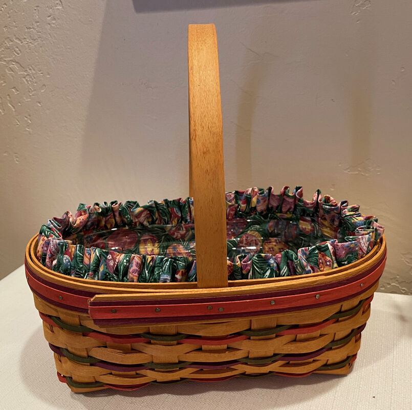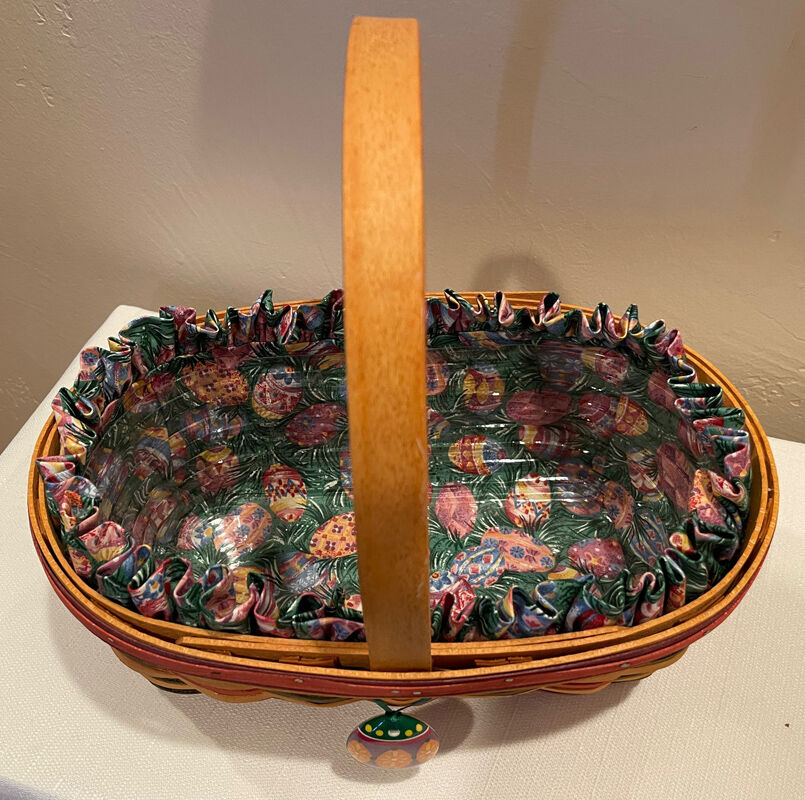 $50. Lovely 1997 Longaberger Easter Basket with Easter Egg Patterned Liner, Plastic Liner Protector, & Egg Tie On. Great condition. Measures approx. 12" x 8" x 12" tall. Cash preferred. Pick up only in southwest Orem or American Fork.