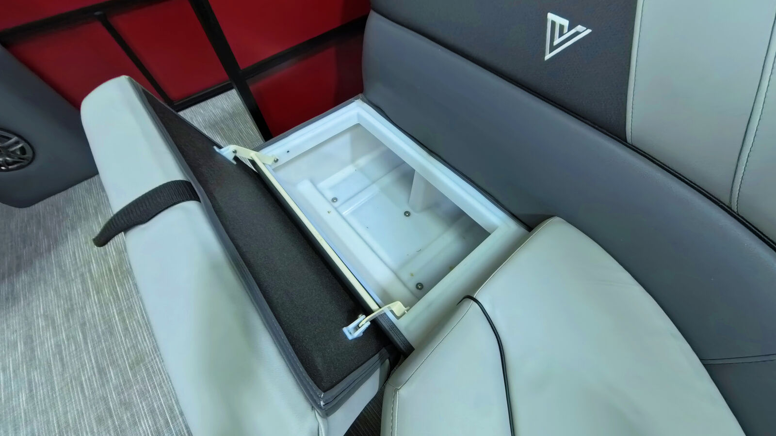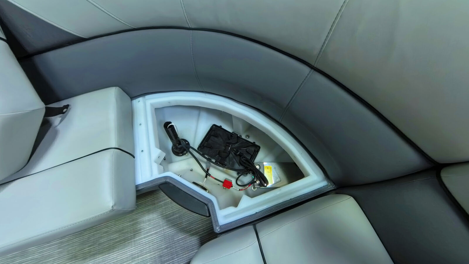 Entertainment is covered with a Clarion audio system featuring a monochrome display and black cup holders throughout. Flip-up seat cushions with hands-free hinges offer added convenience and easy access to storage. A courtesy light brightens your evening cruises, while raised automotive-style decals and stainless steel cleats elevate the overall design.