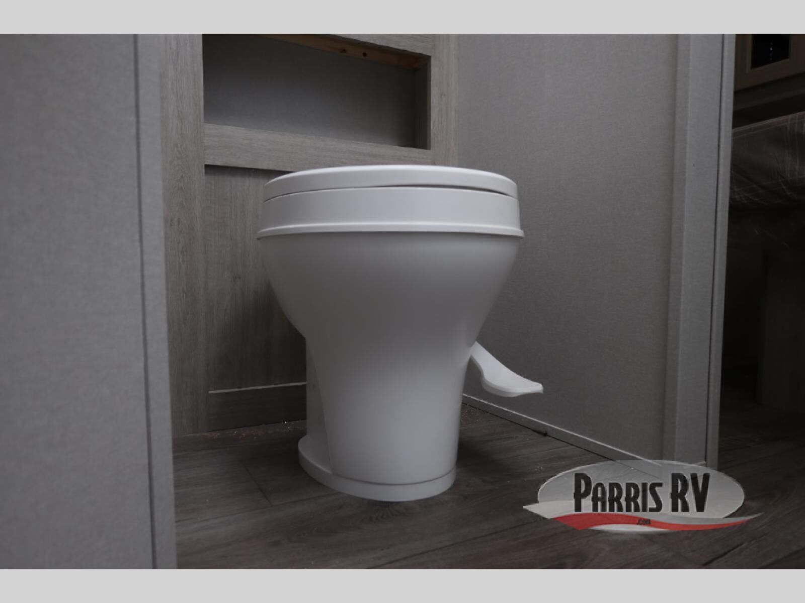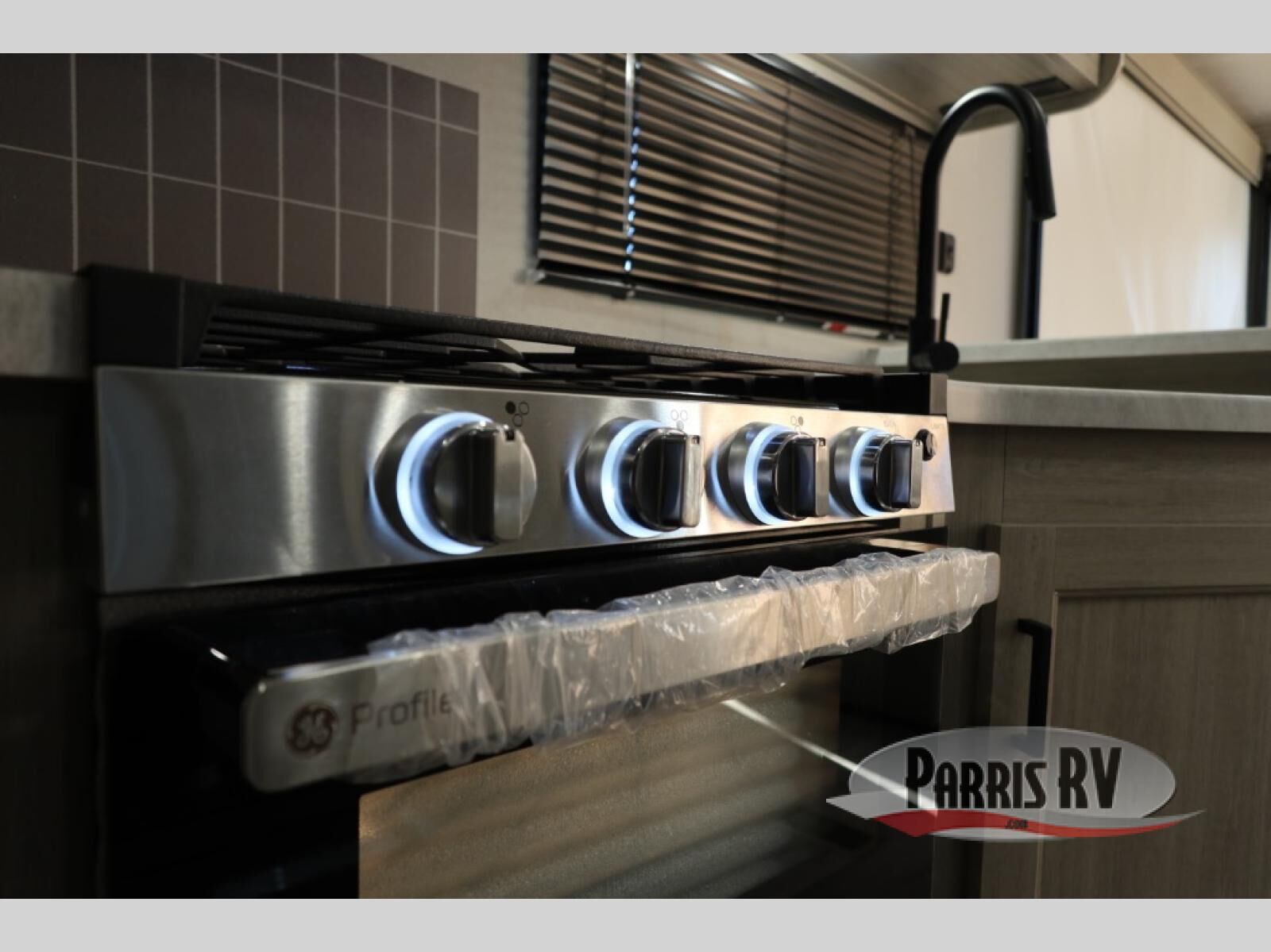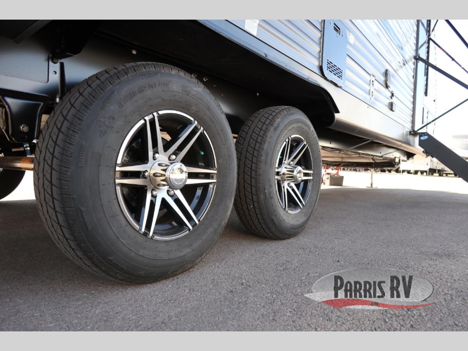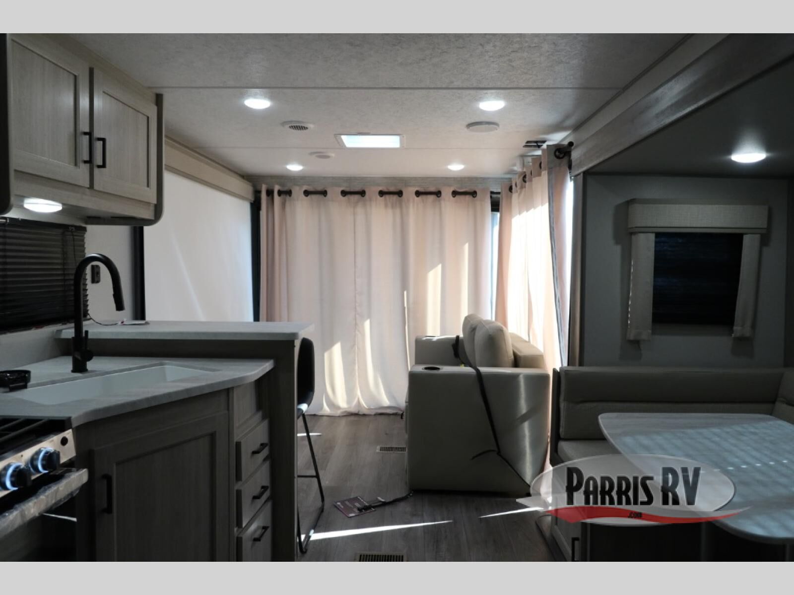 You're bound to love every minute spent in this spacious travel trailer! The rear covered porch includes an exterior entry door here and a patio door to give your unit a more residential feel. There is a sofa that can be switched out for optional theater seating, a U-shaped dinette within the large slide, plus two bar seats at the kitchen counter so everyone has a place to relax. A spacious walk-through bathroom will create a front master bedroom with a 60" x 74" queen bed, dual wardrobes, plus your own exterior entry door for convenience!
