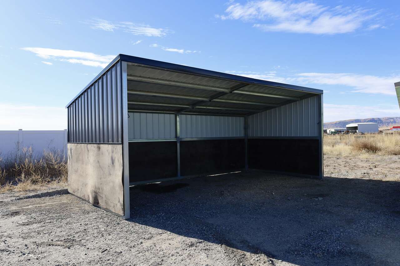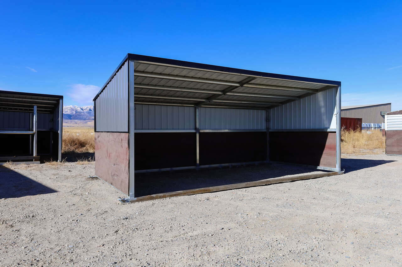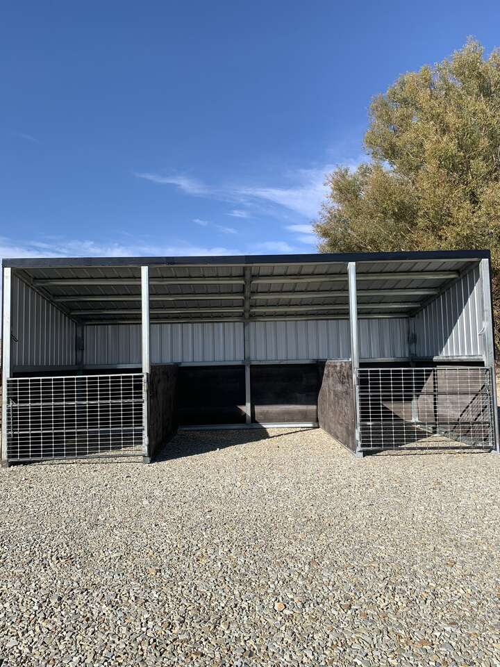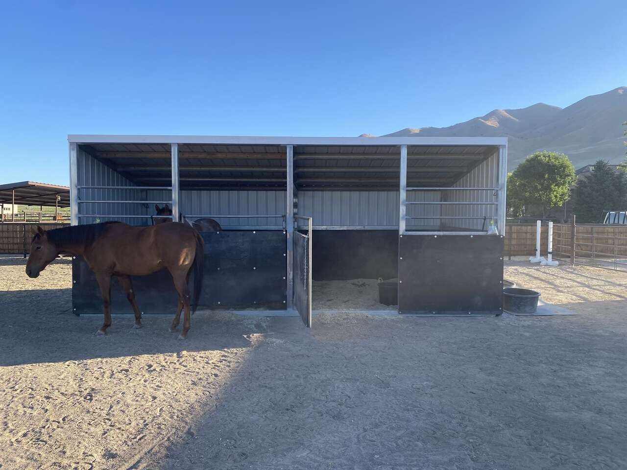 This shelter is made with 4" and 5" galvanized tubing, 3/4-1" kick-proof rubber belting, and high-quality colored tin. This shelter spans 24' in length and is 12' deep, 10' tall in the front allowing any sized animal to fit with ease.