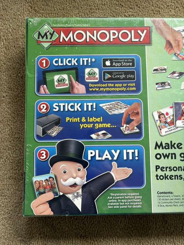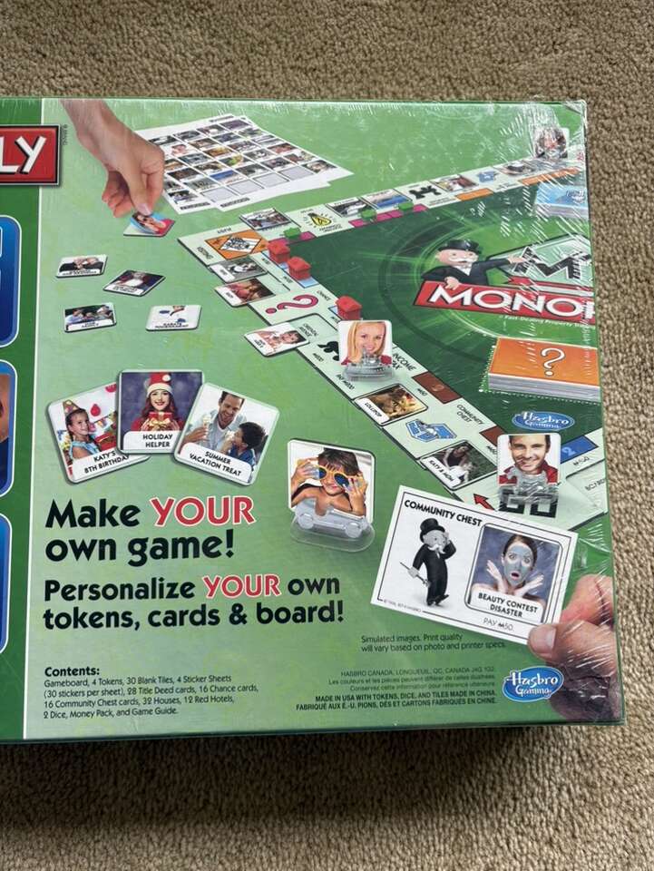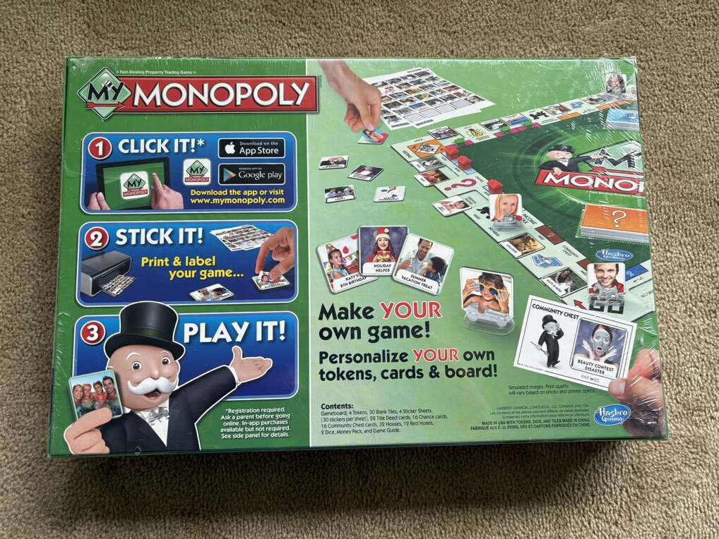 NEW (sealed in plastic) My Monopoly Board Game. Make your own game! Personalize your own tokens, cards, and board. A twist on the fast-dealing property trading game by Parker Brothers and Hasbro, 2014. Ages 8+, 2-4 players. Brand new, unopened condition. Text only. Cash or Venmo.