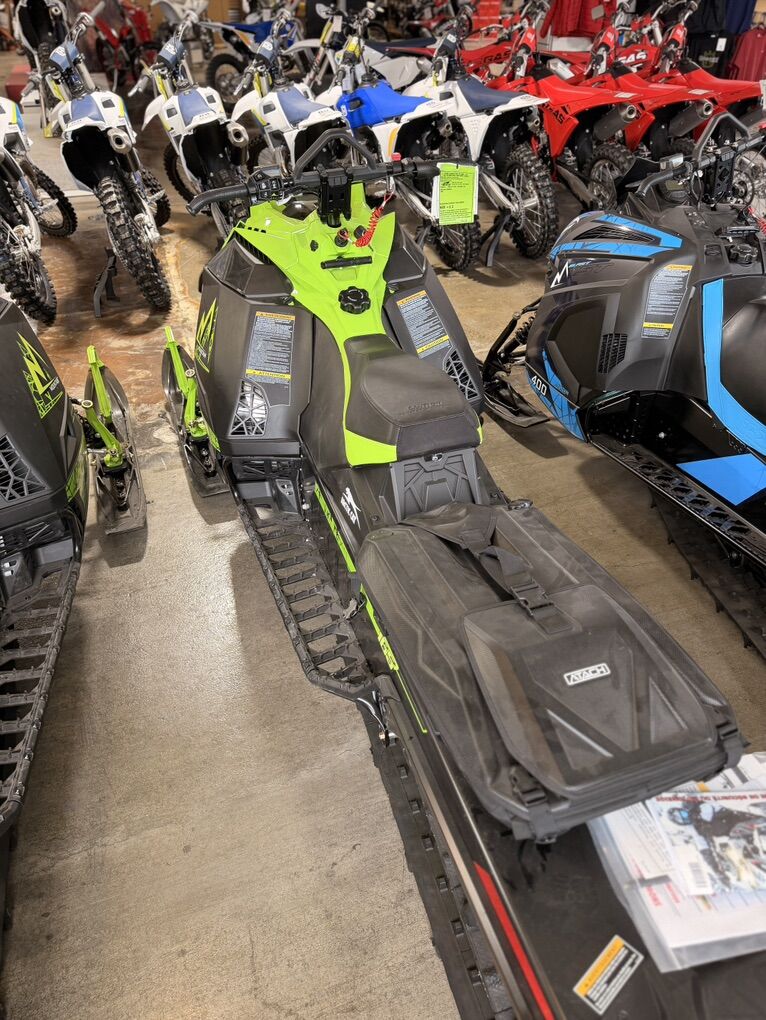 2 stroke twin cylinder fuel injected & oil Injected engine 170 horsepower CVT drive system Pull start High elevation clutching Painted tunnel and rails 165” Alpha One track with 3” lugs 7” width skis LED lighting Goggle holder up front Heated hand warmers and thumb warmers Integrated 12v outlet