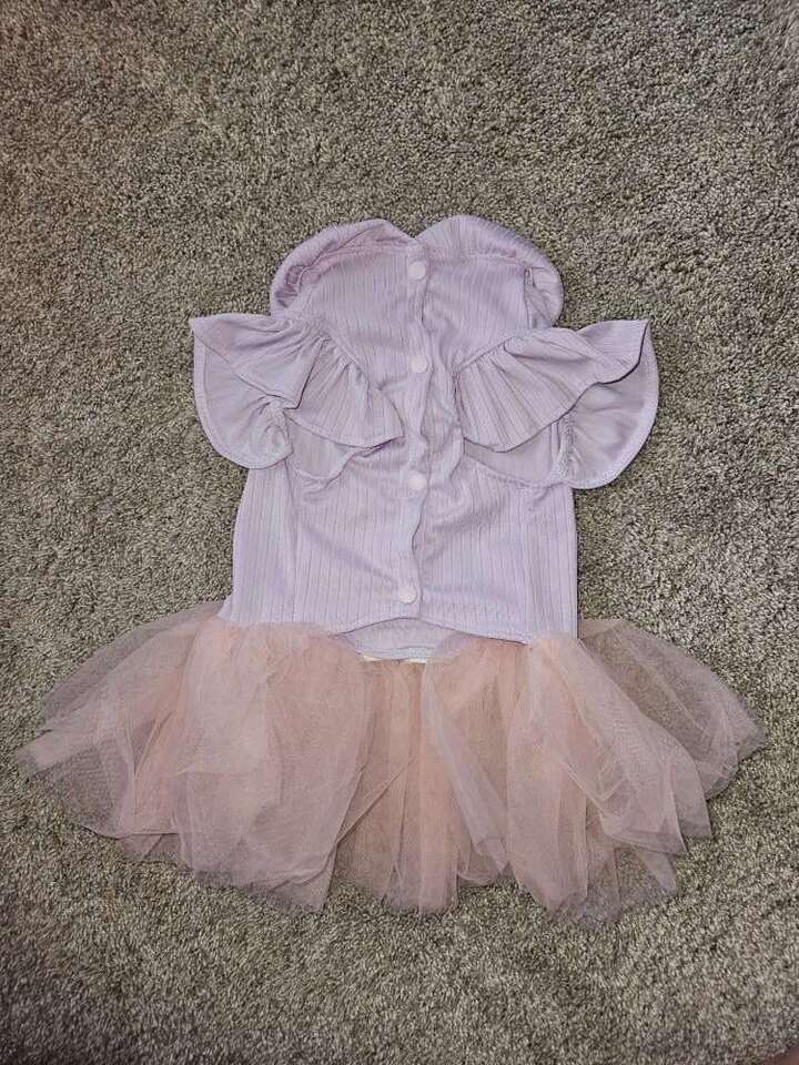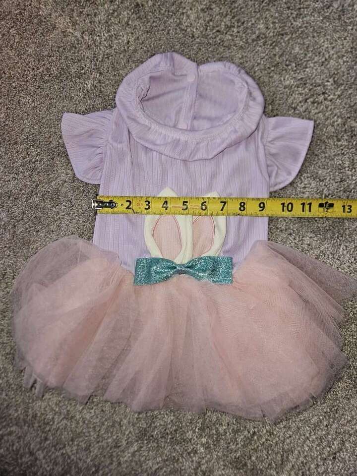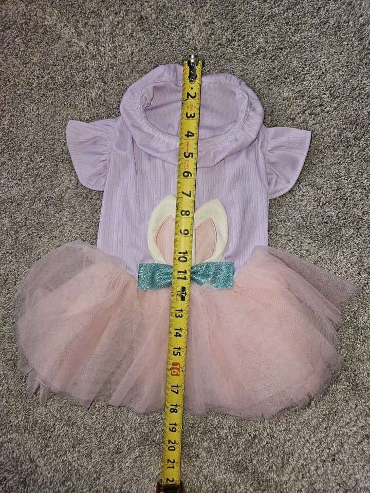 This Easter dress is new never used. Please double check the measuments in the pictures to make sure it will fit your little one, as different brands measure differently. This has the 3 snap closure on the belly. Its 100% Polyester and does have some stretch to it. All my items come from a smoke free home. Any questions please feel free to contact me.