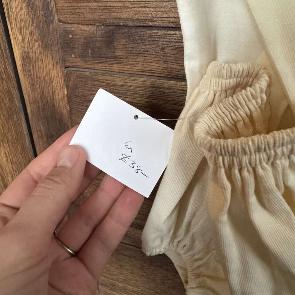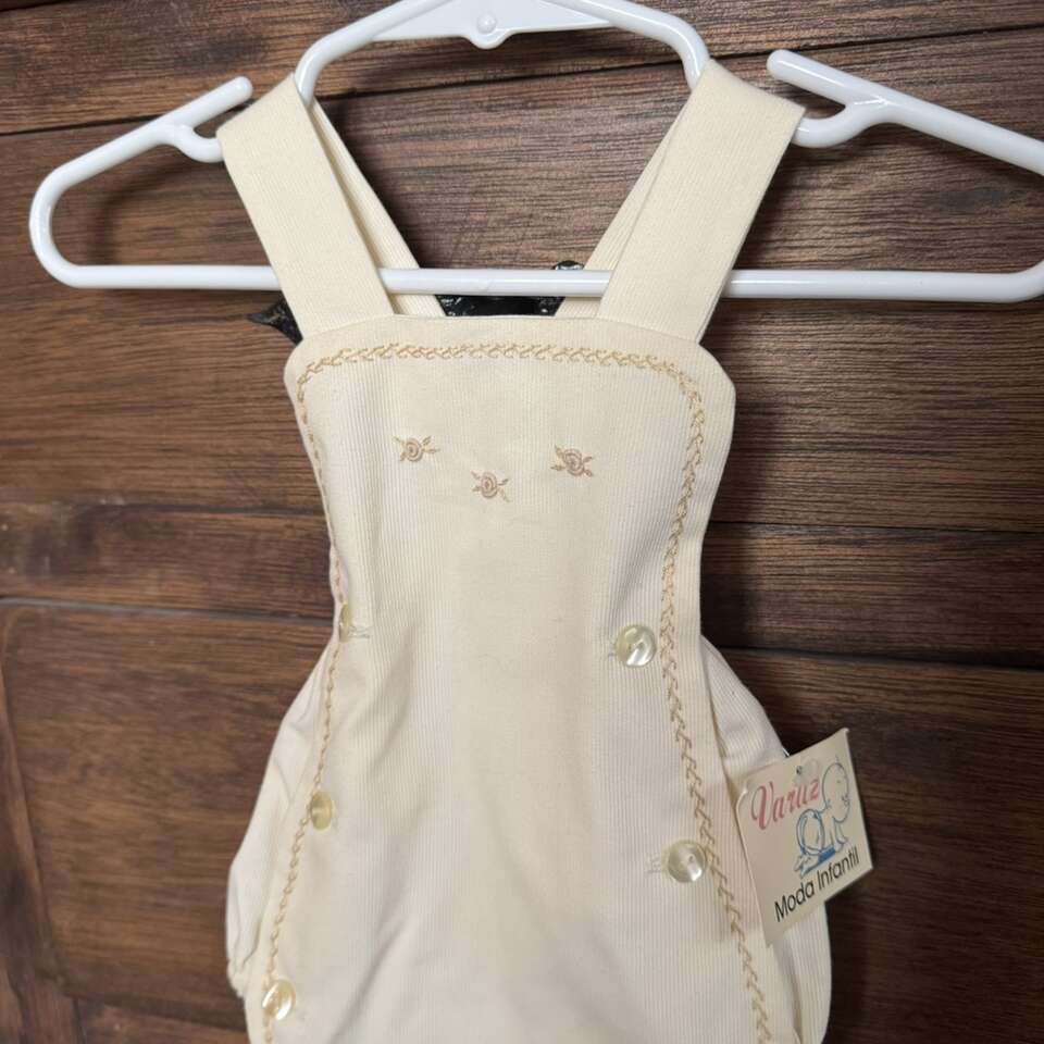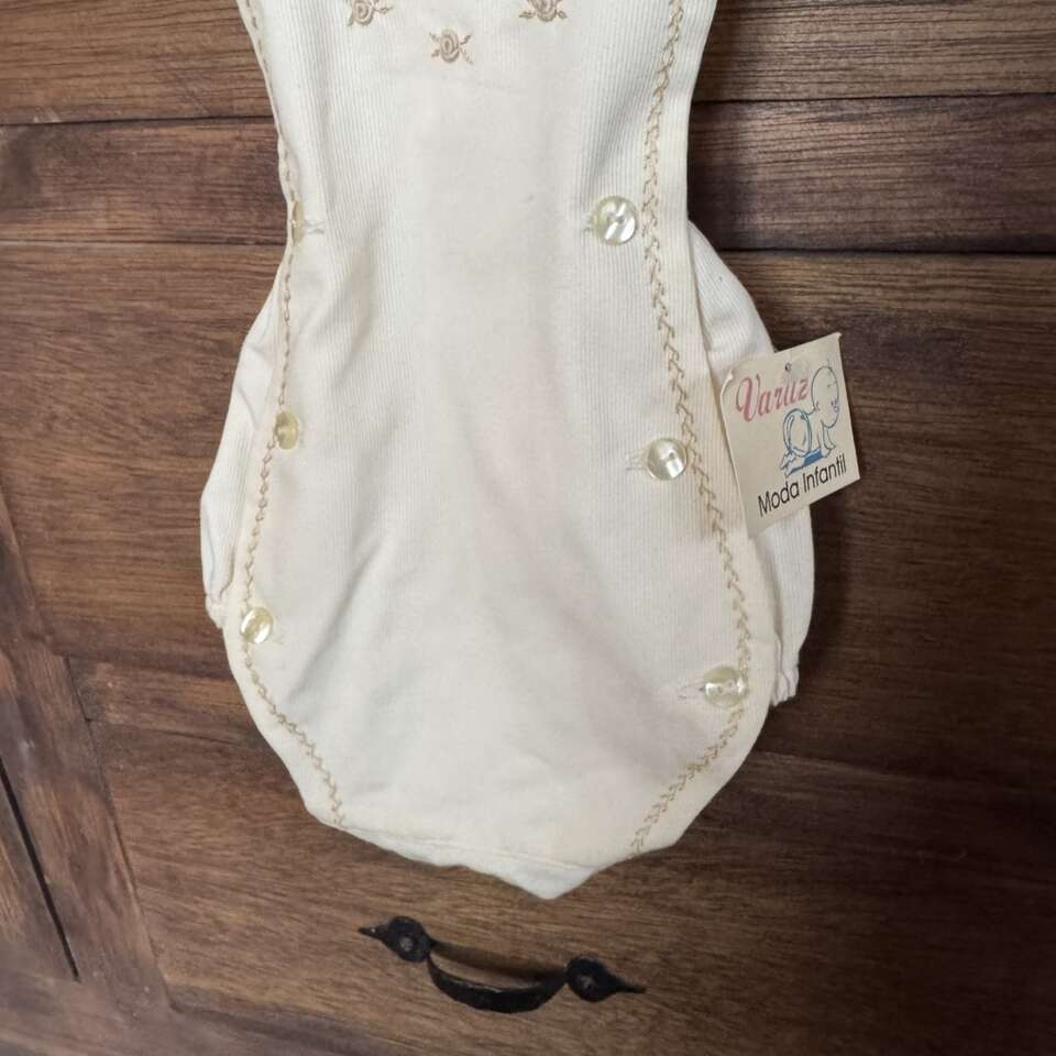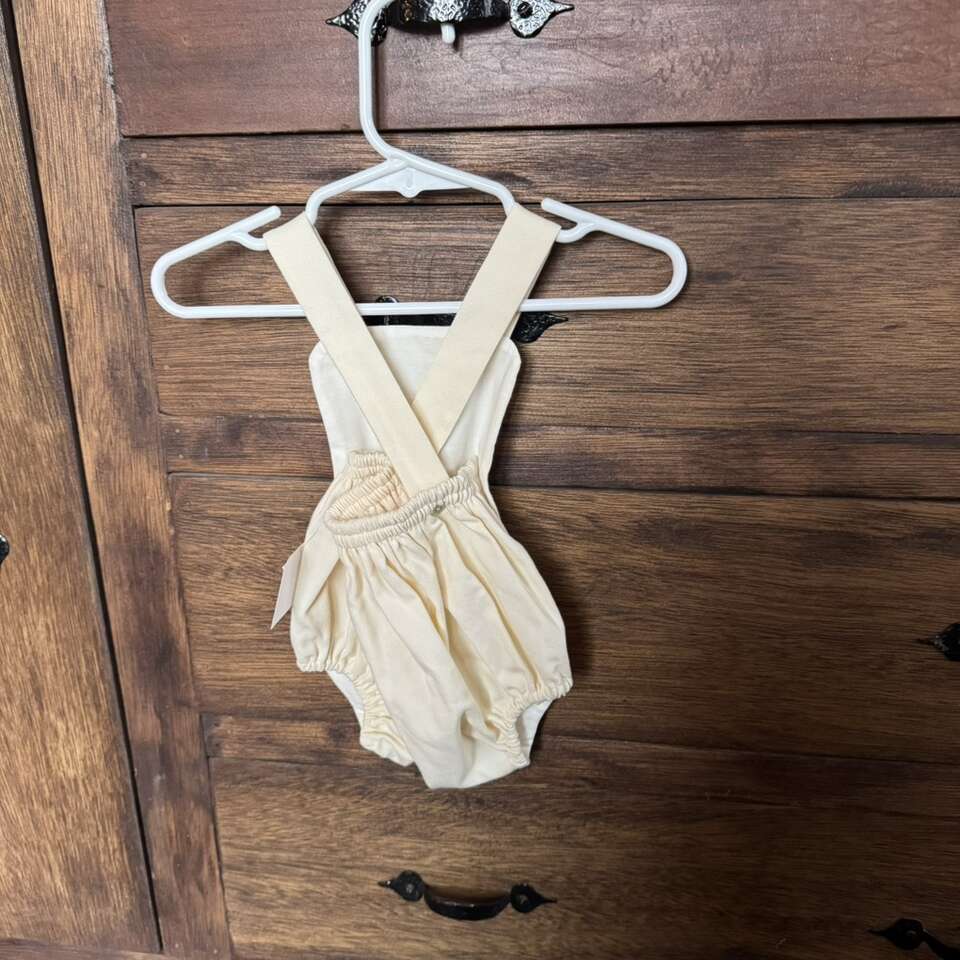 Vintage Cream Baby Romper Blessing Rosettes It’s tagged 6 month but looks more like 0-3 month to me