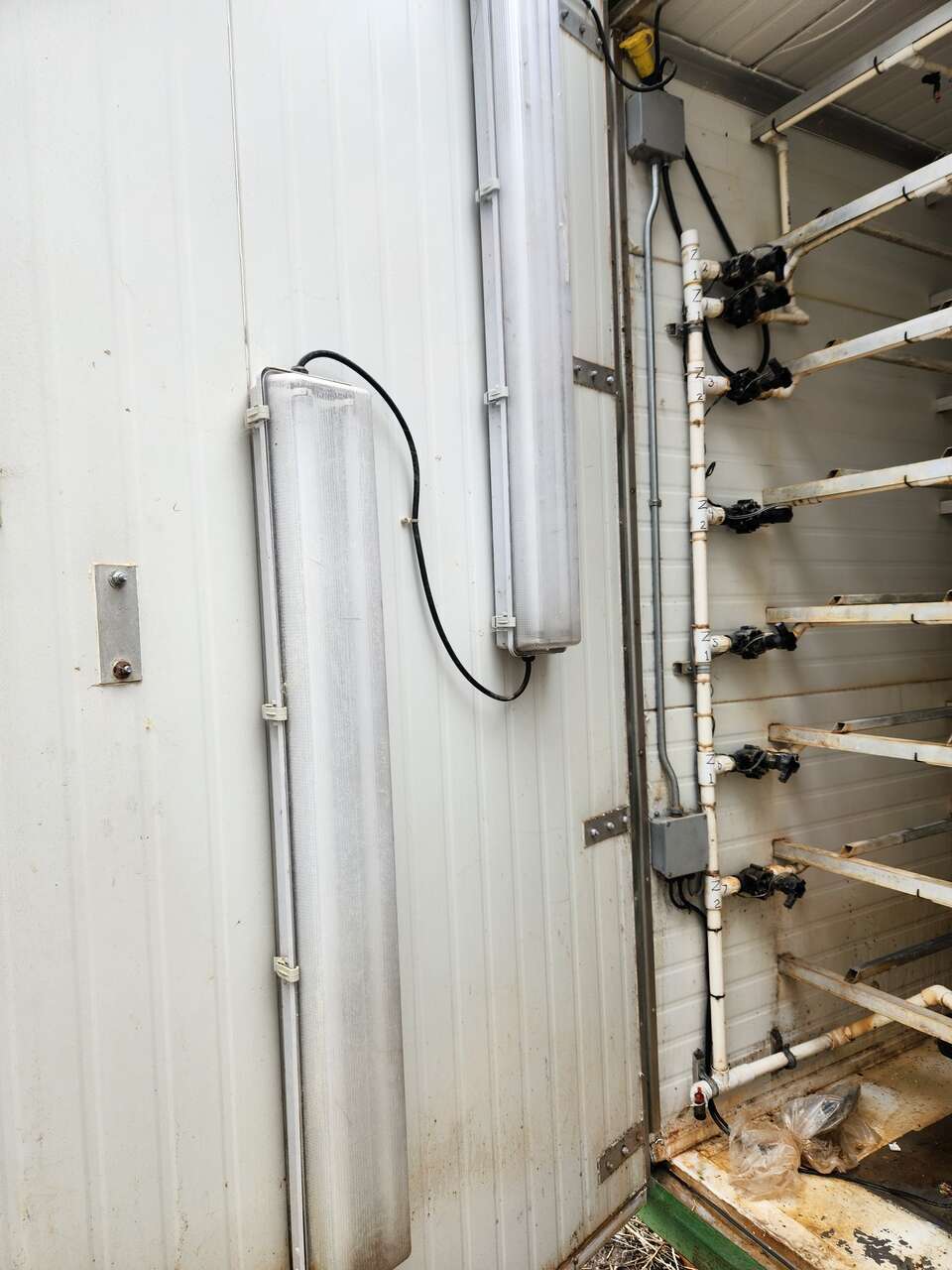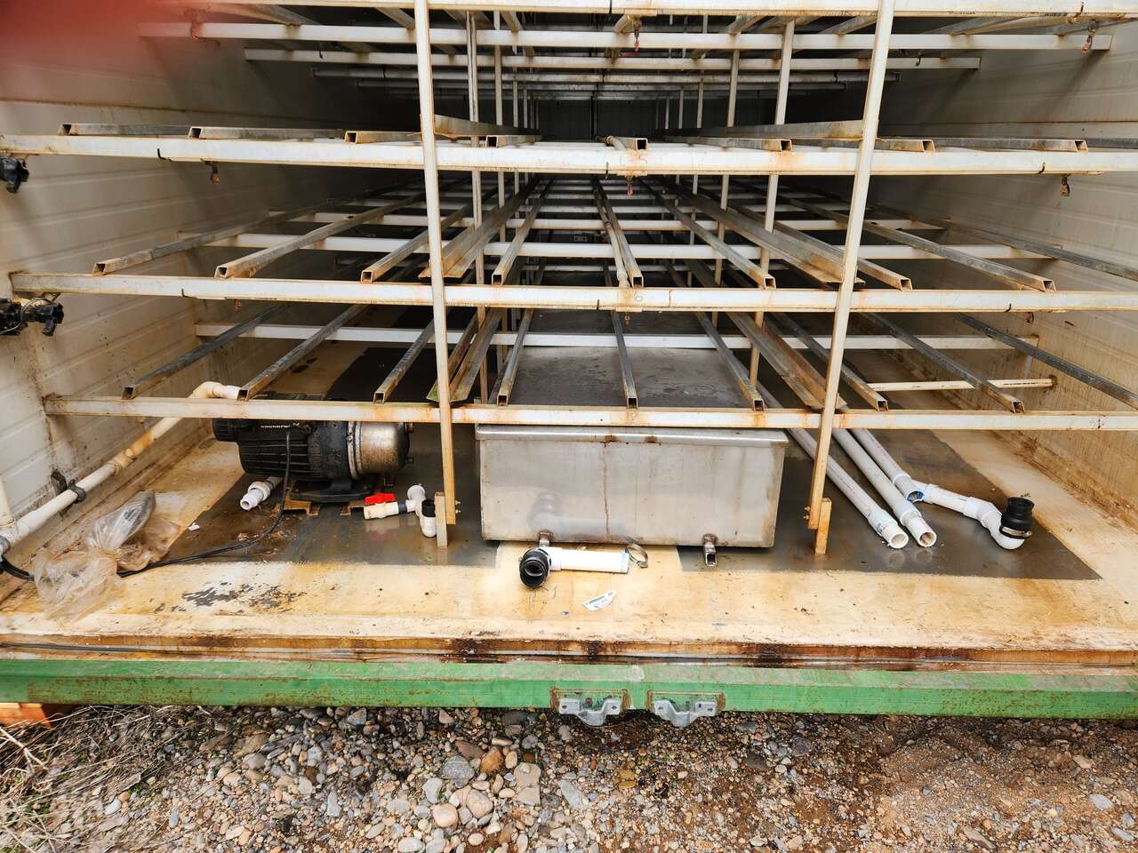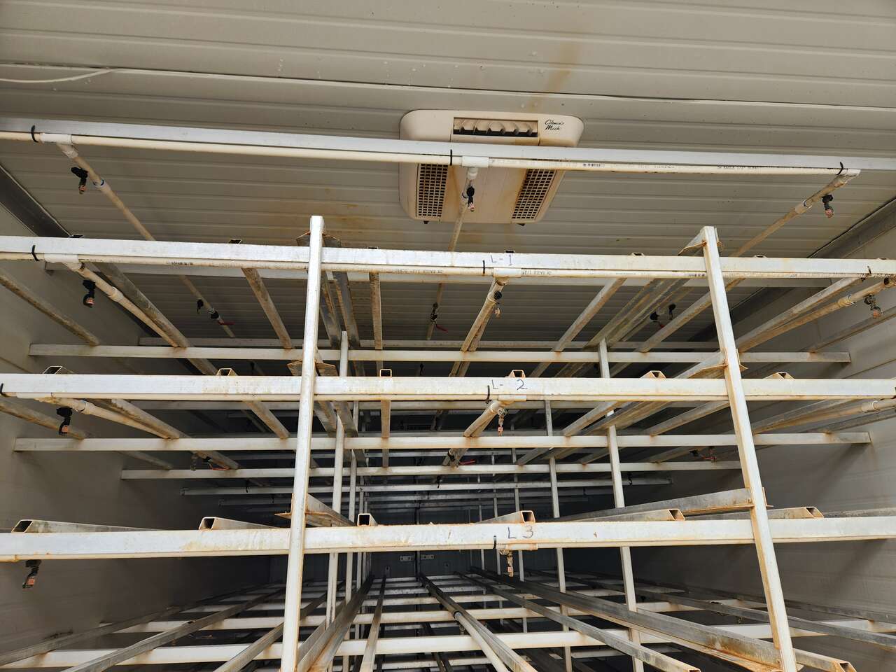 Self-contained fodder unit for sale. We purchased it for some technical experiments and now that we have concluded the work, we no longer need it. It is housed in a container and can be operated indoors or outdoors. There are two A/C-Heat units to maintain temperature and air circulation. It has an internal water tank and float for constant water levels. Fodder is sprayed from overhead on each tray with two watering zones and an internal water pump. There are seven levels, each level three trays across and six trays deep, capable of over 1,000 lbs of fodder/day.