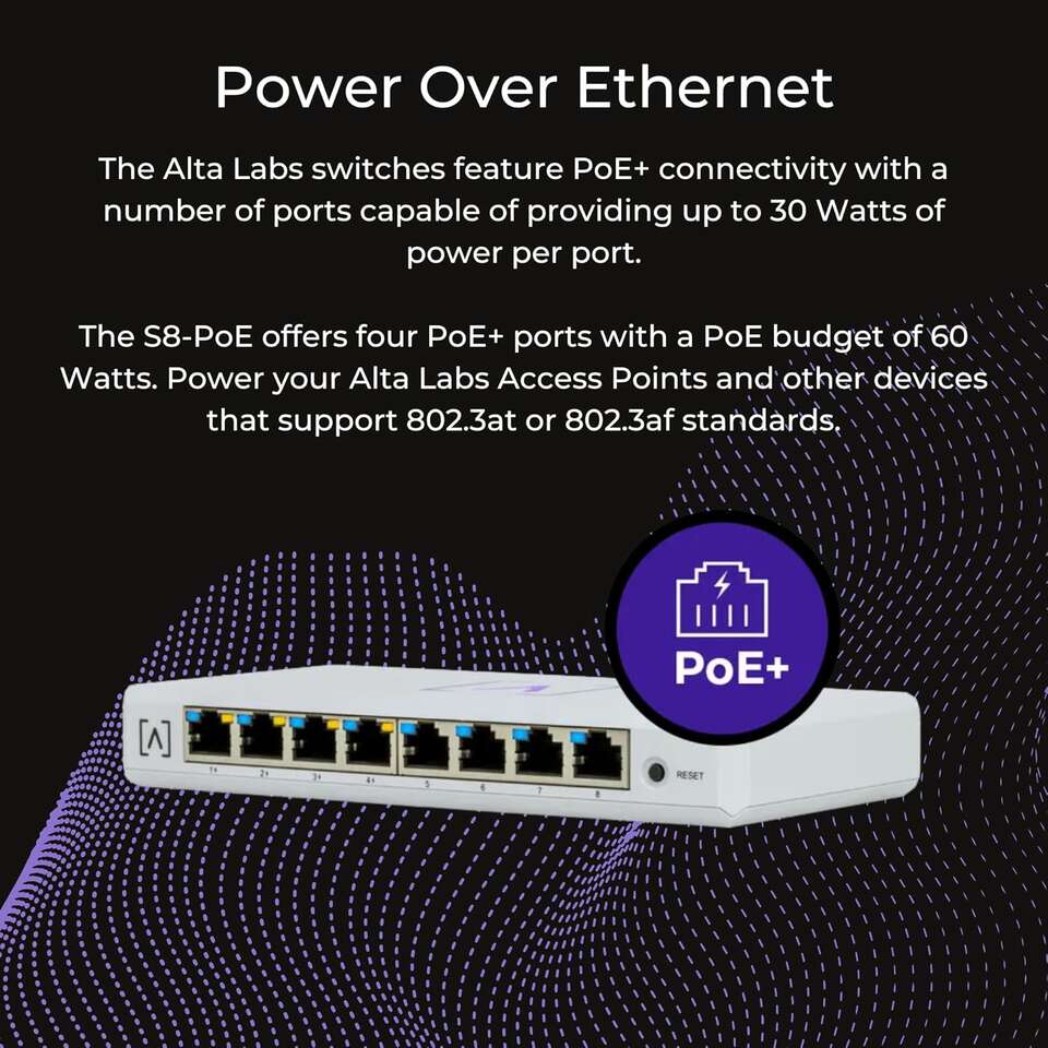 PayPalIf the listing is still up and not marked sold, it's still available. Alta Labs S8-POE Manage Network via Cloud or Local Controller Desktop or Wall Mount Number of Ports 8 Switch Type managed Voltage 48 Volts Maximum Power for POE 60 Watts Interface PoE, RJ45 Data Transfer Rate 1Gbps