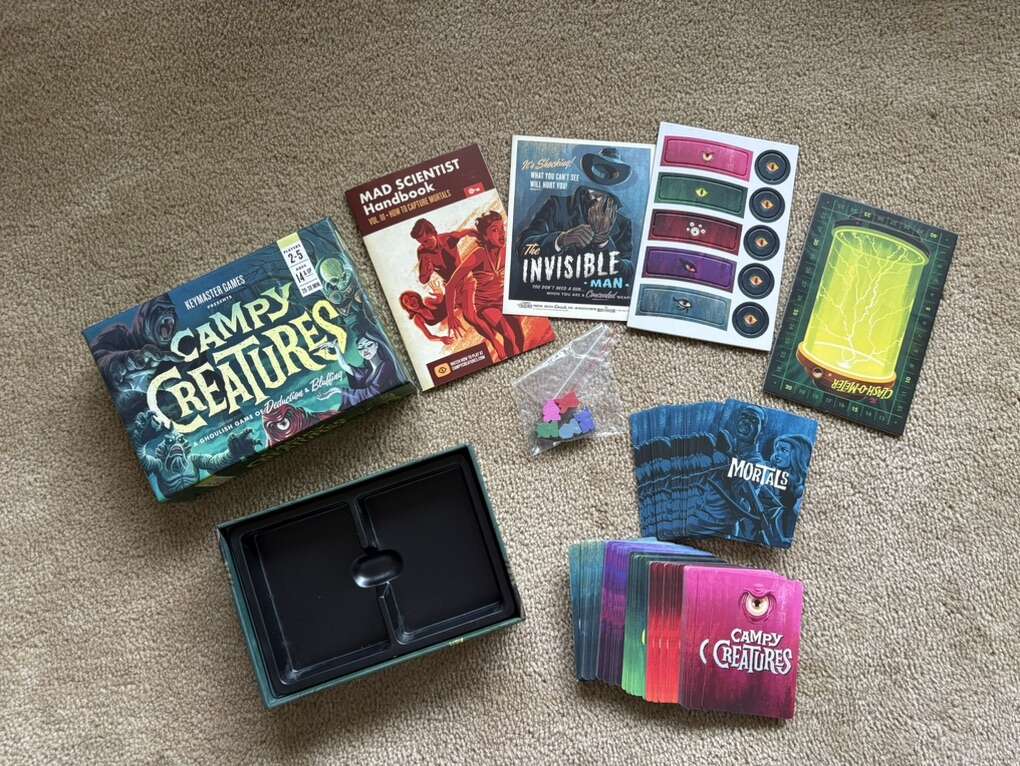 COMPLETE/NEW (open box, unpunched components) Campy Creatures: A ghoulish game of deduction & bluffing. Keymaster Games, 2017 (rare first edition). 2-5 players, ages 14+. Complete, no missing pieces. High-quality game. Excellent condition, like new, with unpunched components. Text only. Cash or Venmo.