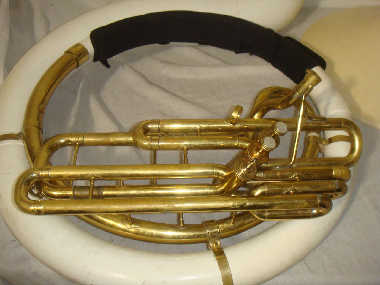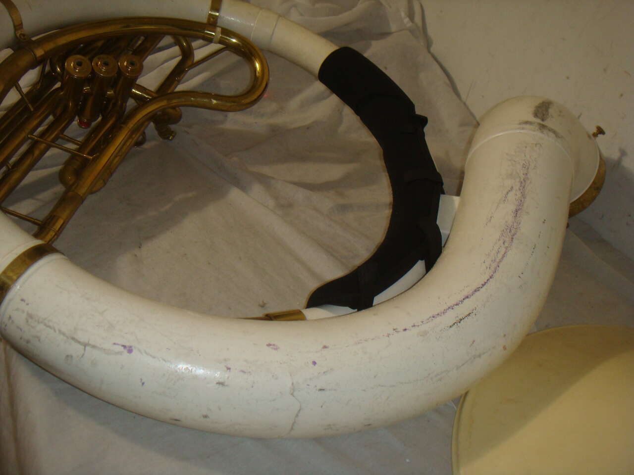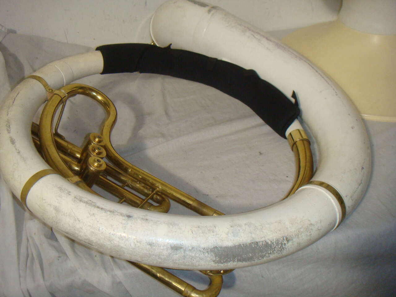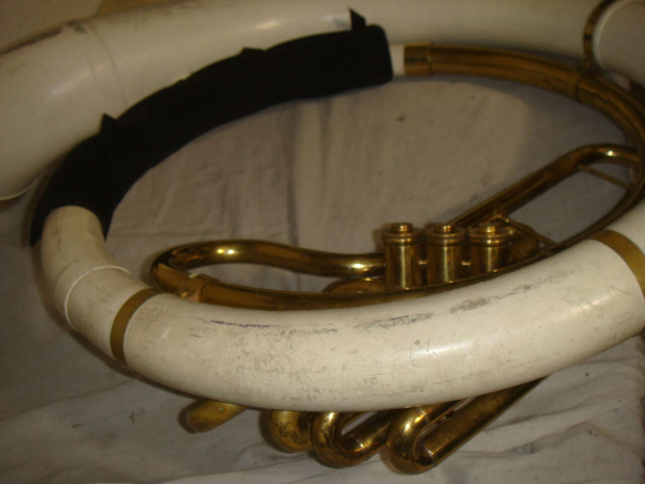 Jupiter Jsp1000 Qualifier Fiberglass Sousaphone With Hard Case. This is a well used tuba that we received as you see it in the photos. it has surface marks, scratches, dings, and is missing one of the valve buttons. The valves all seem to move smoothly, but could probably use some grease. There is one spot on the fiberglass neck section that has some cracking in the fiberglass. It it's still solid and firm when you push on it near the cracks making it seems as though it might just be the outside, but we can't see that far inside to tell if it passes all the way through (maybe if you had a borescope you could tell). I would imagine it would be a very minor fiberglass repair either way. Aside from the marks and dings, it seems to be in good overall condition. Because of the nature, we're selling it as-is for cheap. These are usually $5500-6000. This is your chance to save big-time if you need a practice horn, or as a refurb project. It comes with everything shown. This is your chance to save big-time so don't miss out!!