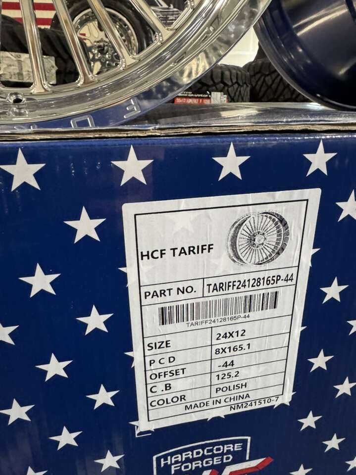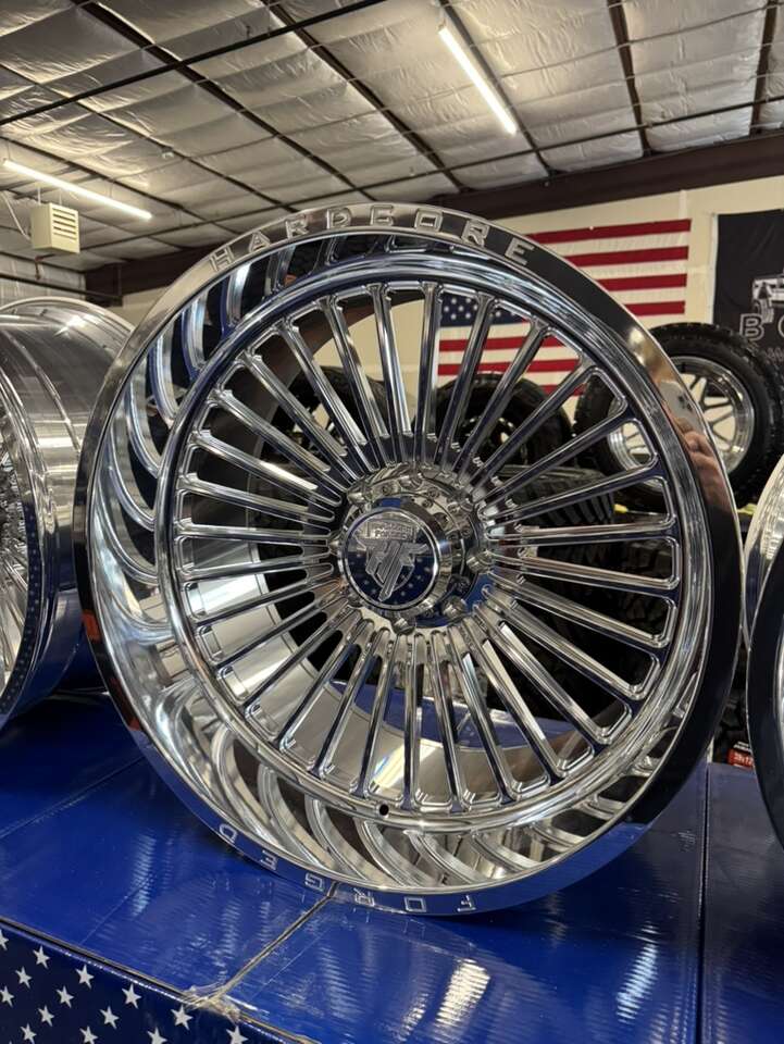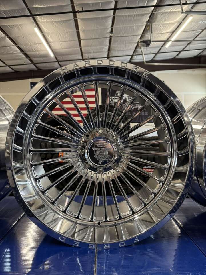 ZelleBRAND NEW IN THE BOX 24x12 hardcore forged “tariffs” 8x6.5 bolt pattern Billet forged aluminum wheels Mirror polished finish Billet forged center caps Concave design
