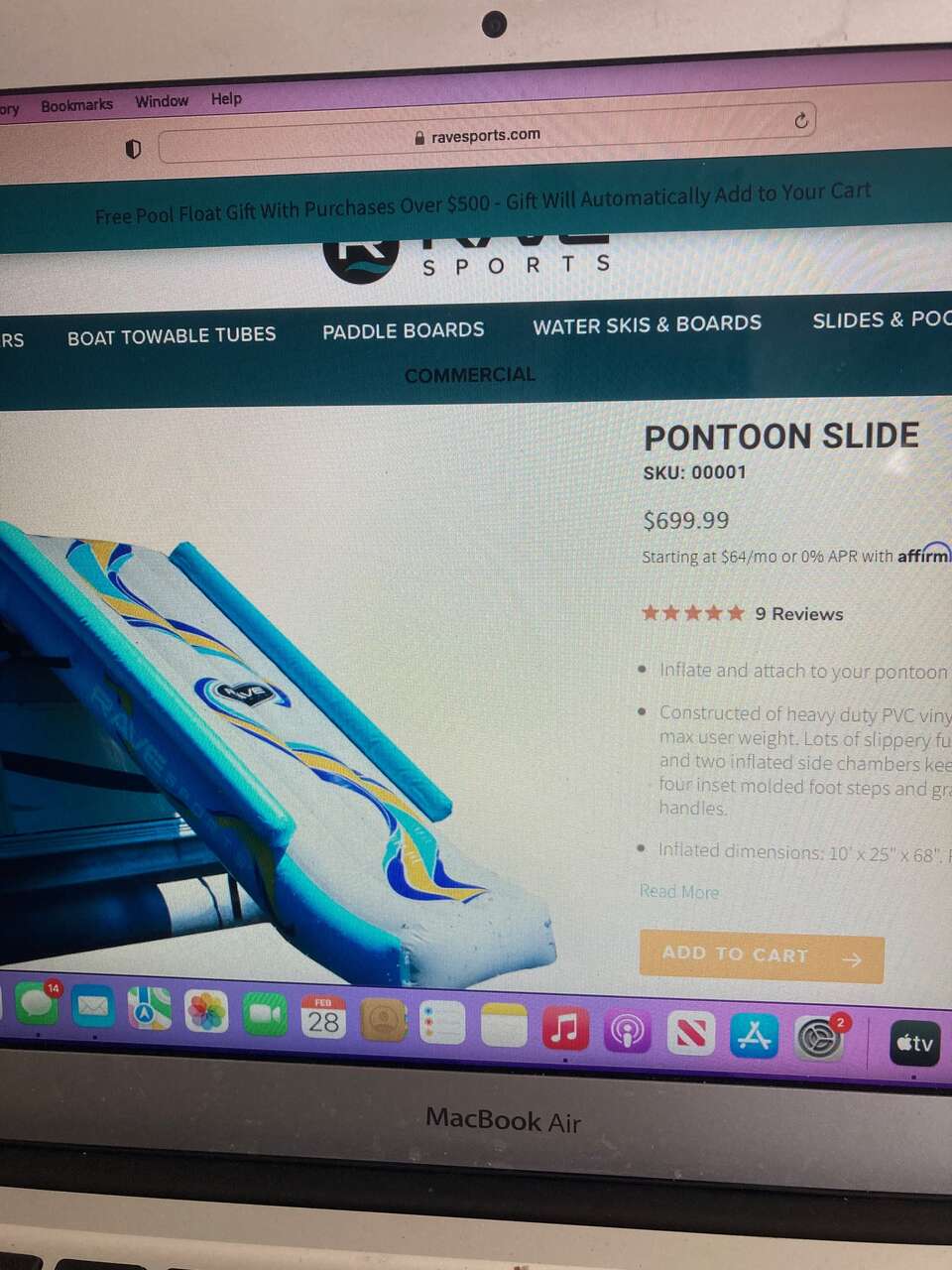 The inflatable Pontoon Slide features a 9' long, slick sliding surface, 2-slider centering air chambers, four-inset vinyl molded footsteps, and two vinyl assist handles welded on the top. Once you've finished the fun, simply deflate and roll up for easy storage. Comes complete with a 12V high-pressure inflator/deflator that can run off the pontoon battery. Fits most pontoons. 5' of water depth required