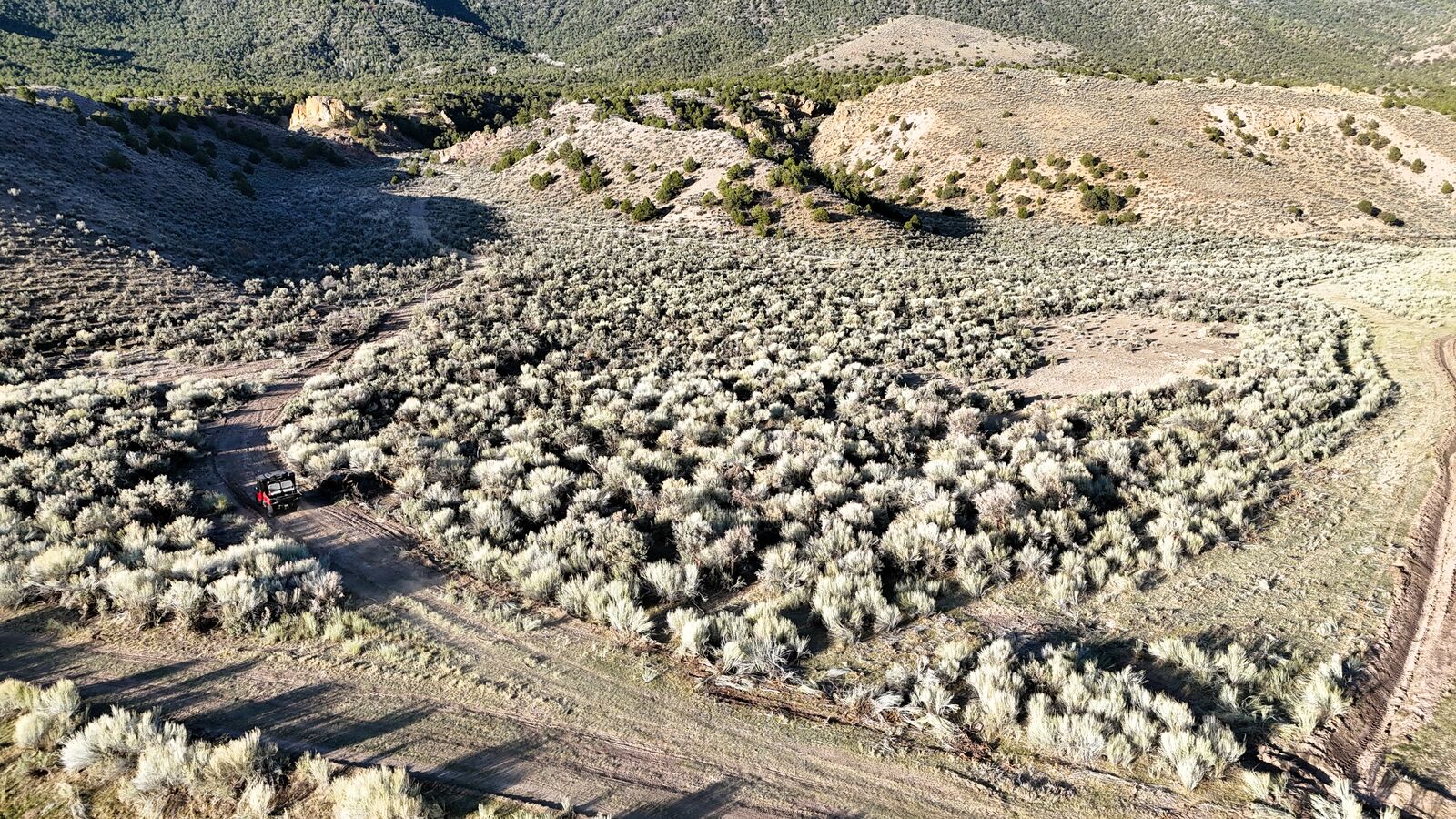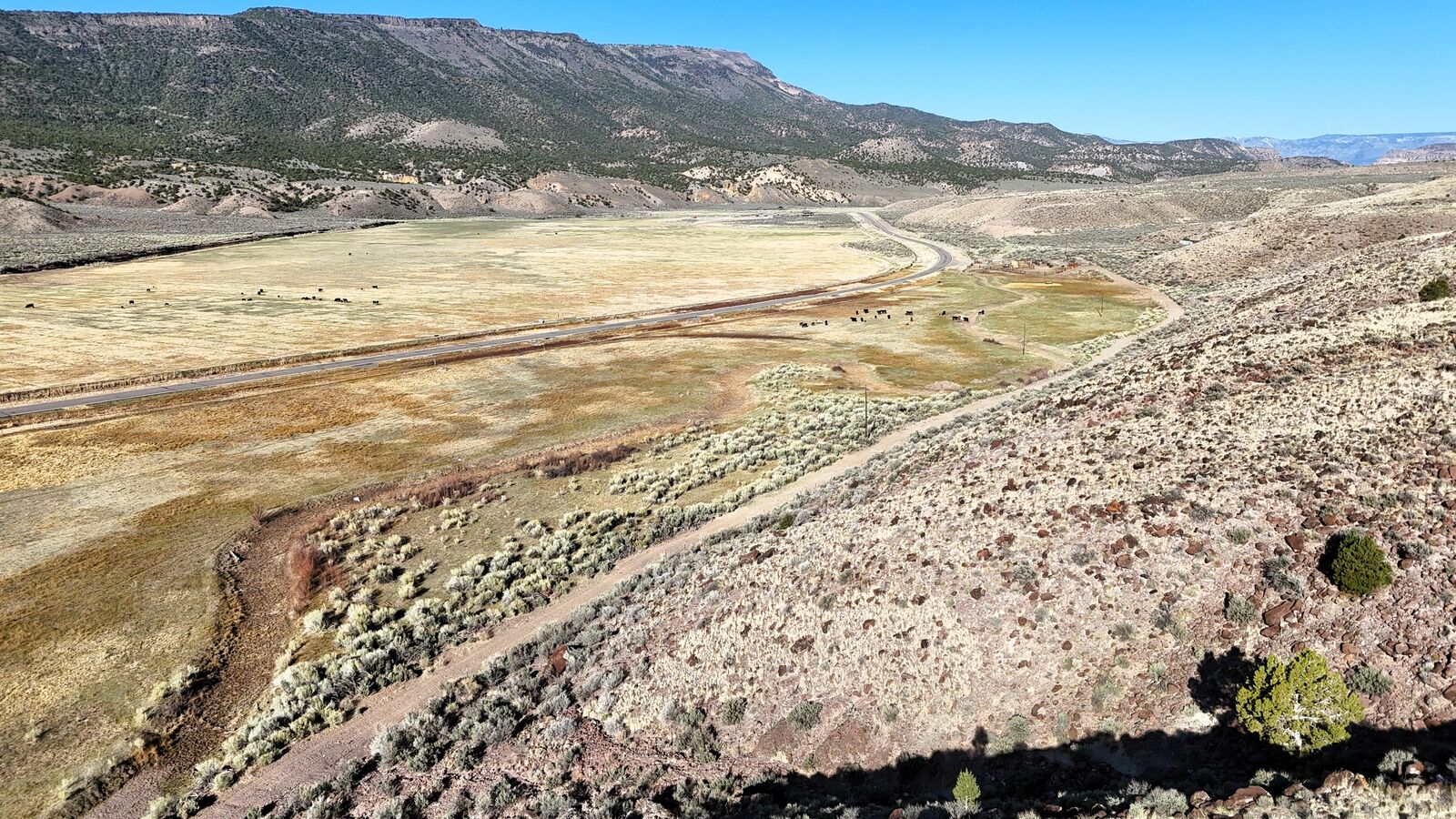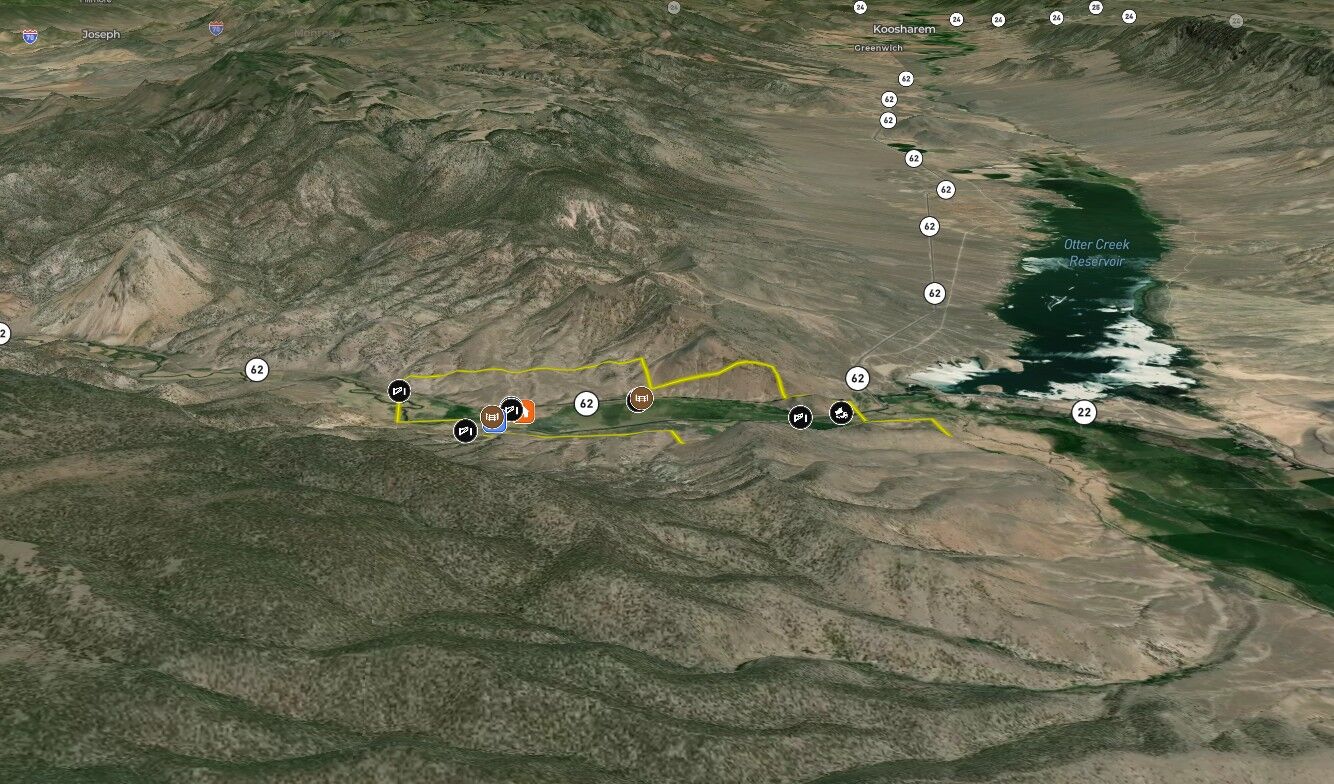 On the north side of the highway, the property rises dramatically over 400’ above the river bottom to a peak elevation of 6770’. The northeast corner of the property has a gravel pit with paved road access, several springs feeding nearly 30 acres of premium grazing ground, corrals, power, and a well permit for a 2nd home. The north side of the highway is covered with rolling sage hills with a few cedar trees across the majority of the 300+ acres. This side of the property provides the gateway to a BLM grazing lease for another 50 AUMs. In several places, there are dramatic overlooks of the river bottom property, the surrounding mountains, and breathtaking views of Otter Creek and Antimony.