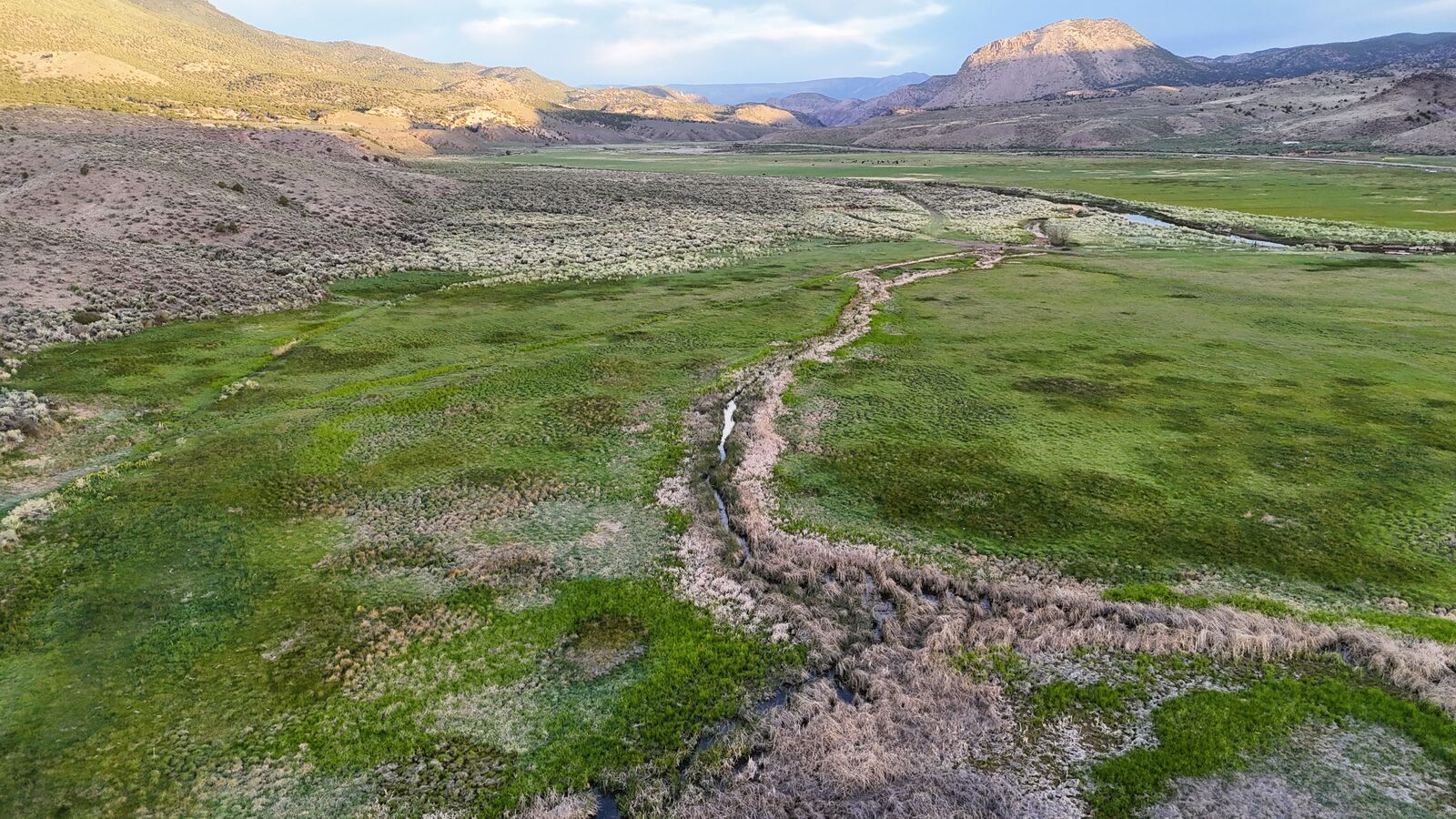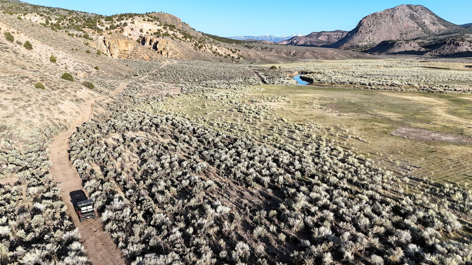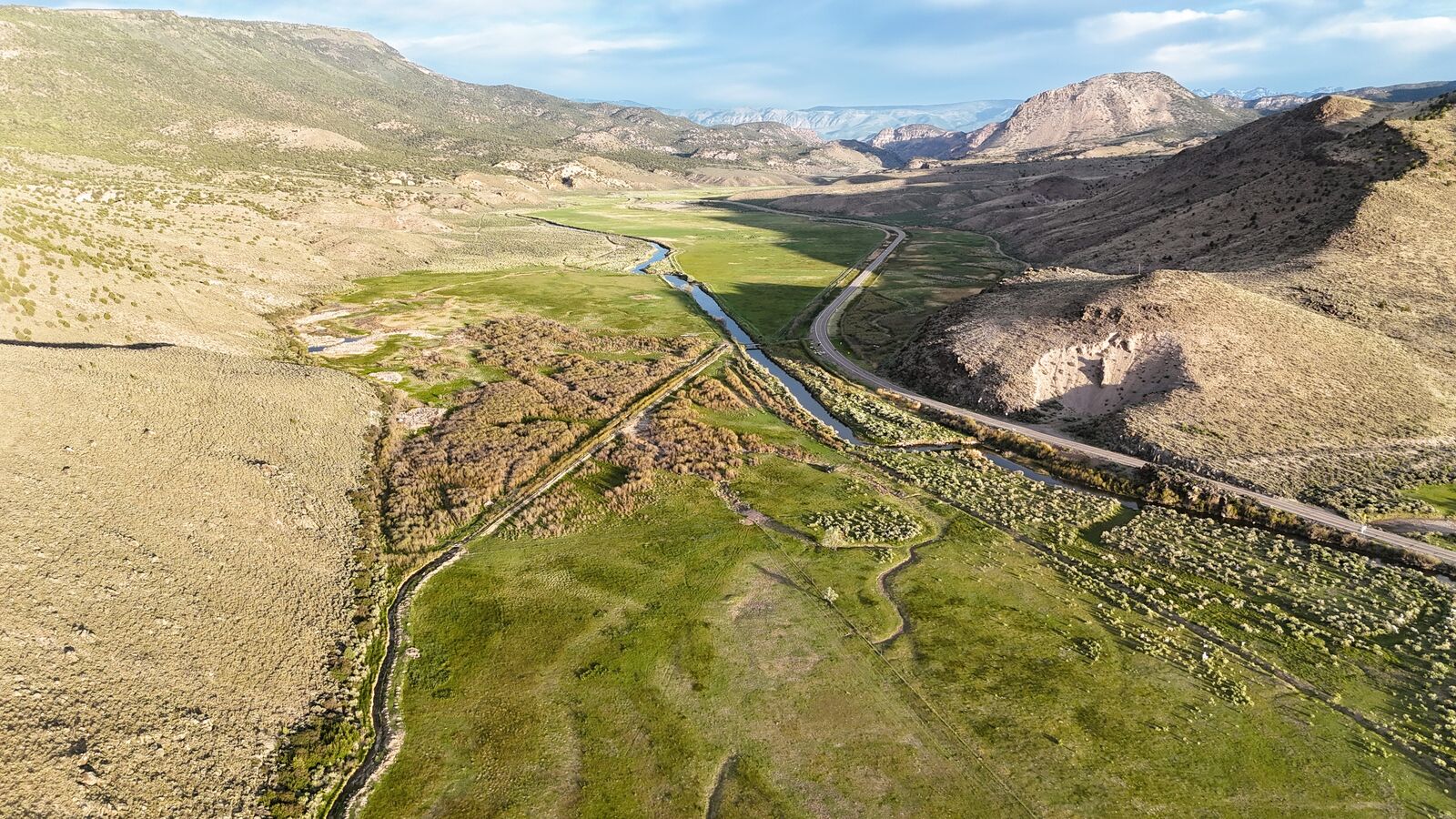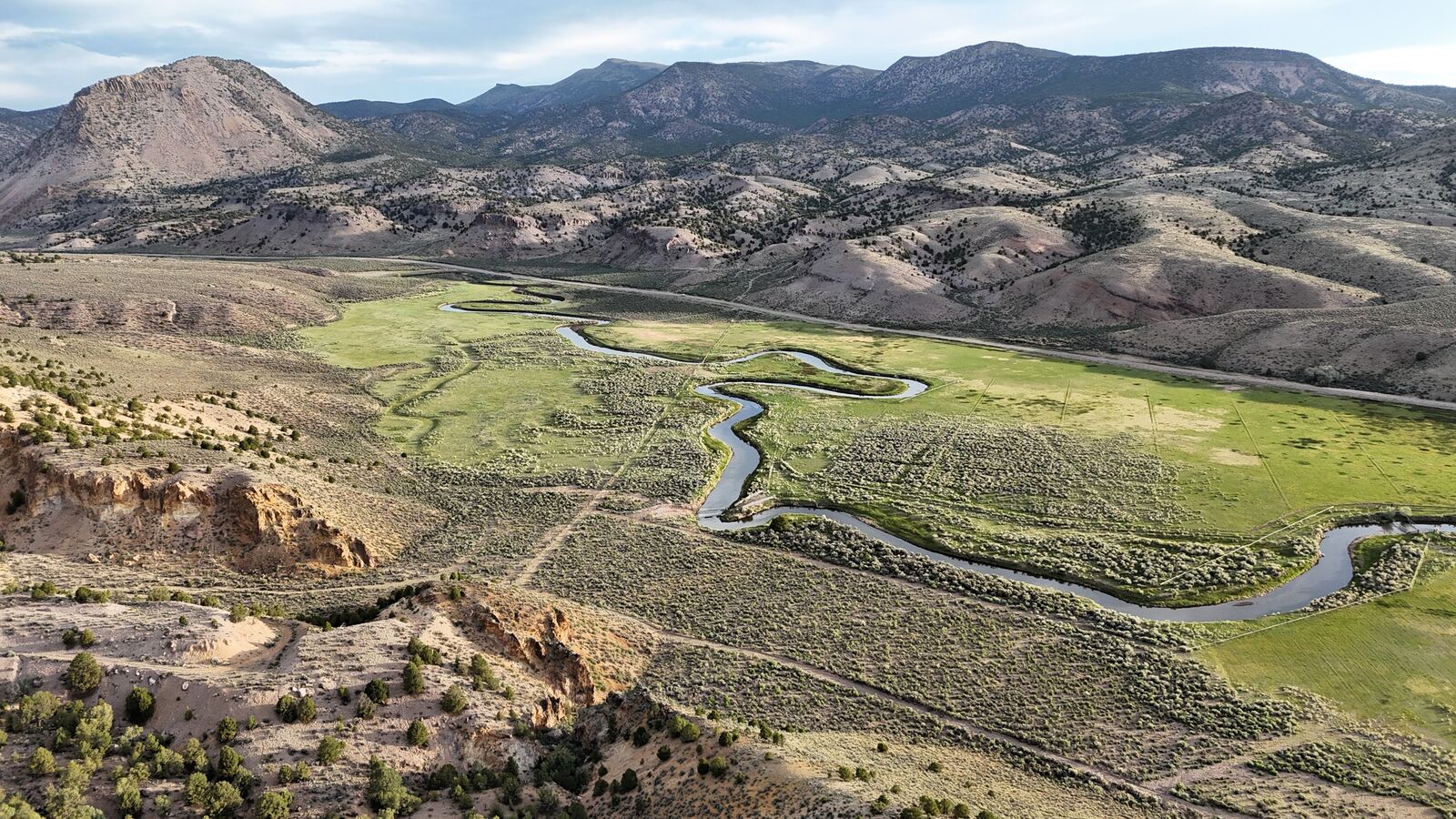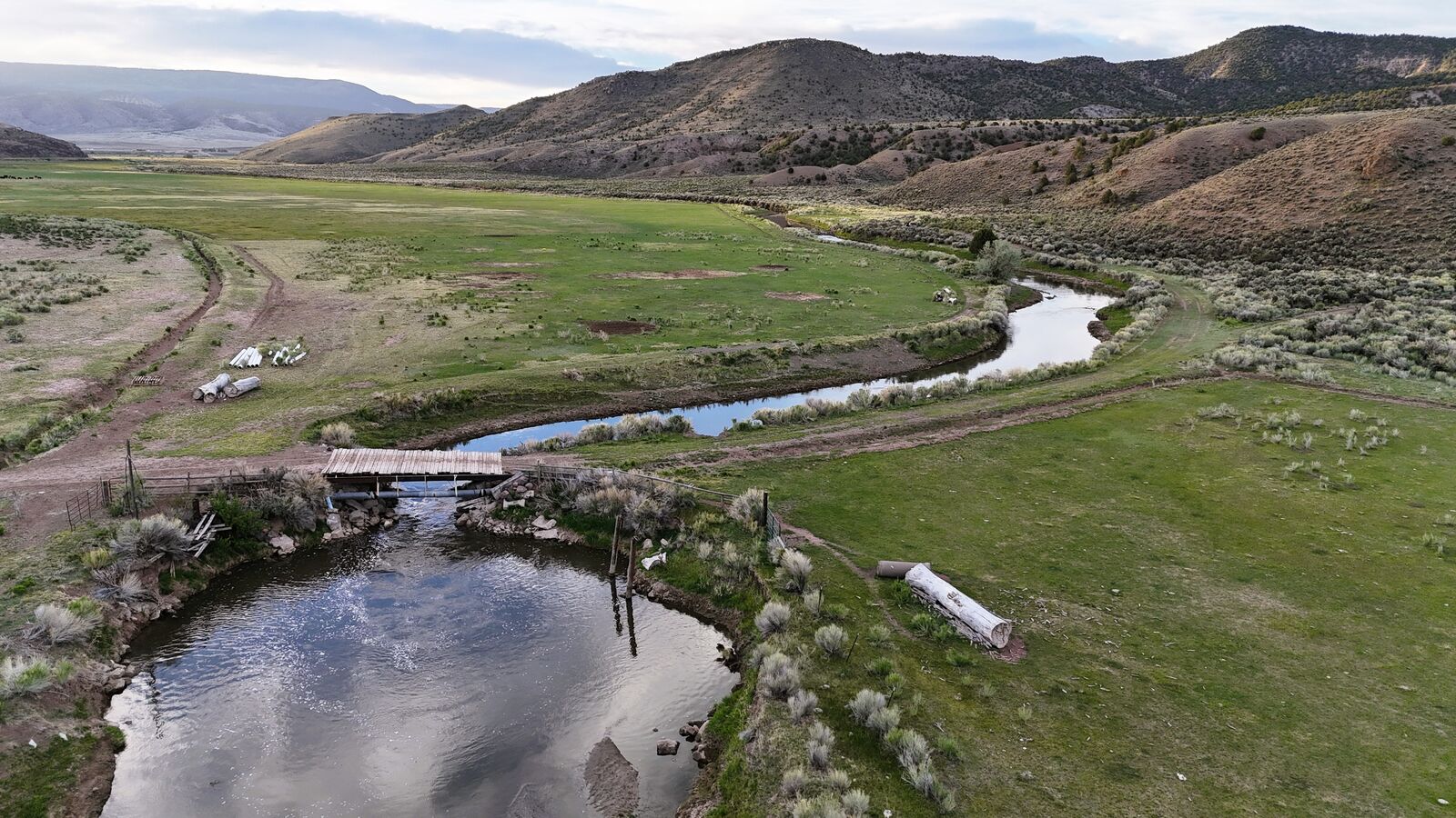 The south side of the property has multiple year-round springs which feed wetlands rich in wildlife, including ducks, geese, sage grouse, and deer. The river meanders peacefully through the property, providing plentiful water for cattle and multiple areas to experience premium fishing. A well-maintained 1674’ 3-bedroom 2-bathroom home sits overtop a garage with a covered wraparound porch providing views of both the river and the surrounding mountains. Power, culinary water through a well, septic, and propane systems are all in very good condition. There are also working corrals, a squeeze chute, and a bridge over the river, all located close to the main home. An internal road network provides good road access throughout the property, and there are several developed cattle crossings placed at strategic points throughout the river.