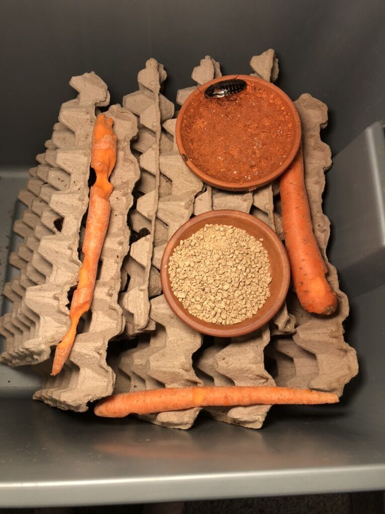 These are healthy, home-raised Dubia roaches available in a variety of sizes. All roaches are raised on a high-quality grain mix and gut-loaded with fresh fruits and vegetables, making them a nutritious feeder for reptiles, amphibians, birds, fish, and other insect-eating pets.