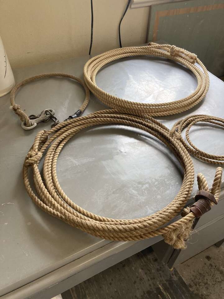 Two calf ropes. One pigged string and one neck rope with beautiful vinyl covered rope can cash only pick up only.