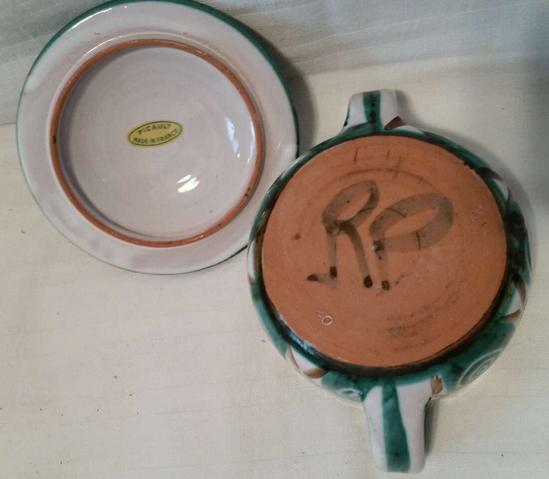 Rare Vtg Bowl Ceramic Handles/Lid Signed R.P. Robert Picault Vallauris #20 1950, No chips or knicks.... This rare vintage bowl with ceramic handles and lid is signed by Robert Picault of Vallauris, a renowned French ceramic artist from the mid-20th century. The round bowl features a stunning white, brown, and green color palette, embodying the Mid-Century Modern style popular in the 1950s. This original piece of French culture is a sought-after collectible for those interested in vintage dinnerware and serving-ware.