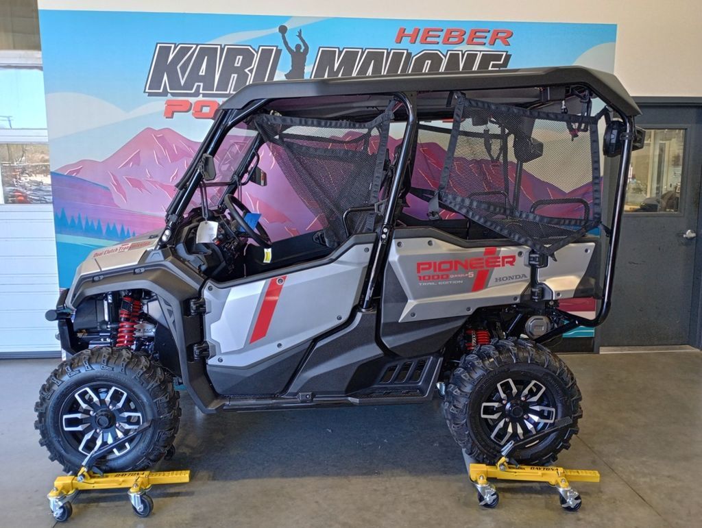 2025 Honda® Pioneer 1000-5 Trail Special Edition Versatility is its virtue Versatility and a do-it-all attitude—that's what the Pioneer 1000-5 is all about. QuickFlip seats let you carry up to five people and fold flat for carrying cargo. The 999cc engine and automatic DCT transmission are an unbeatable combo. Three trims—including our new Special Edition this year—make it easy to pick one that’s perfect for you. Features may include: 4,500-Pound Warn Winch Black Aluminum Wheels with Contrast-Cut Highlights FOX QS-3 Quick-Adjust Suspension Rearview Mirror Audio System Fully automatic six-speed DCT With the industry’s first six-speed Dual-Clutch Transmission (DCT), you can choose between manual mode or fully automatic. There’s even an easy-to-use tow/haul mode, along with 2WD, 4WD, Differential Lock, and Turf selections. QuickFlip® seating A Honda exclusive, two QuickFlip® seats in the cargo bed open easily and fold flat when not in use. Powerful 999cc twin-cylinder engine With plenty of power—especially in the midrange and top end—you'll experience quick acceleration and exceptional overall performance.