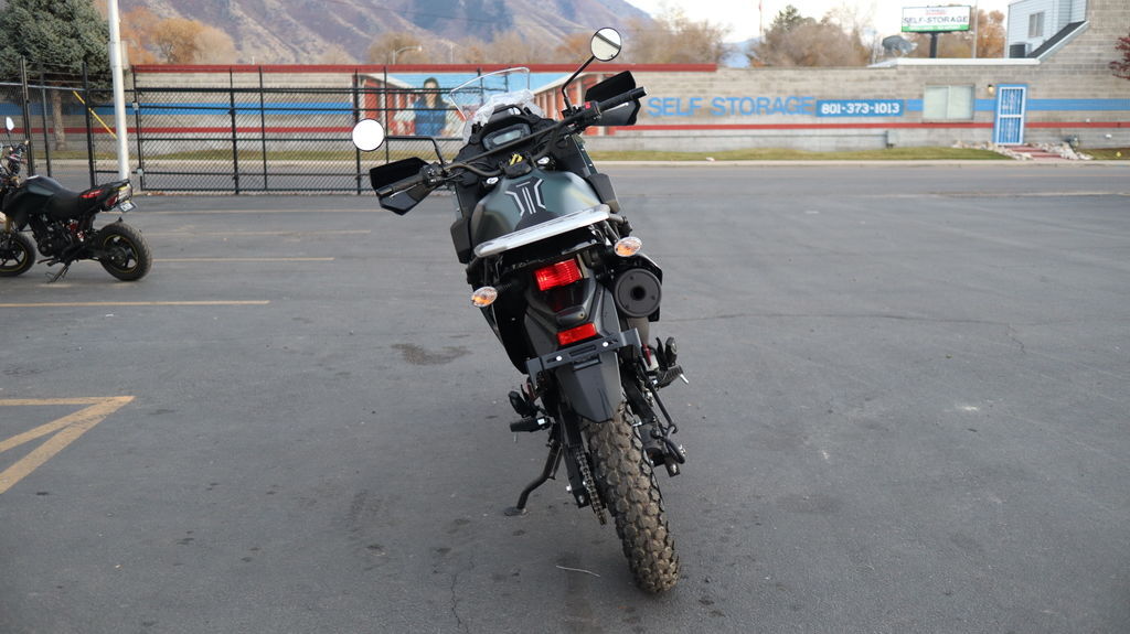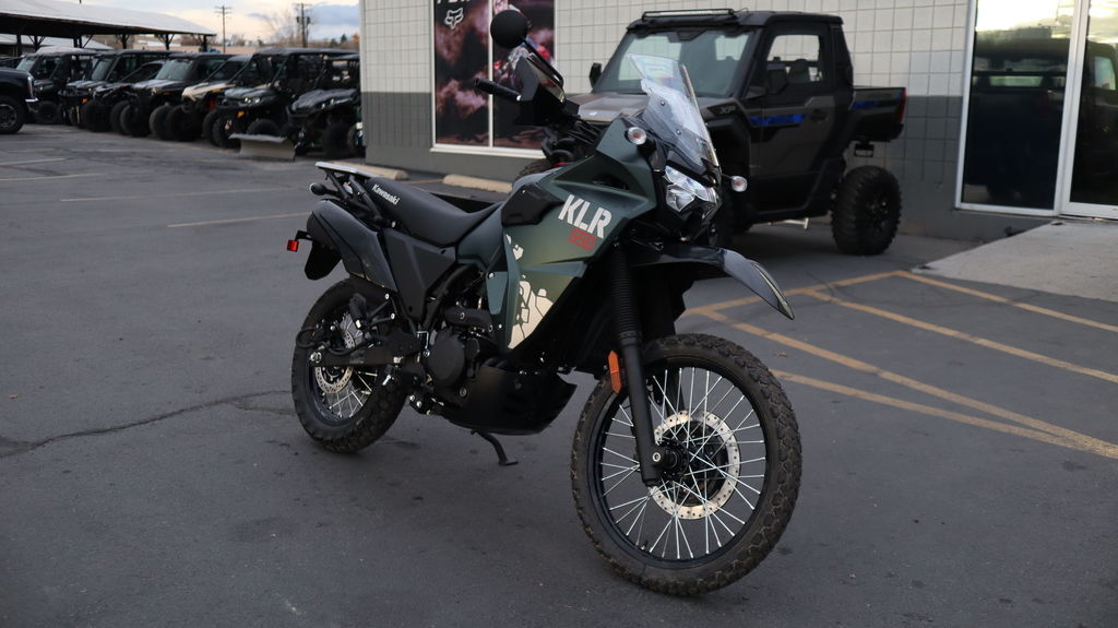 2025 Kawasaki KLR®650 Metallic Matte Old School Green ABS ESCAPE. EXPLORE. ENVY. The KLR®650 motorcycle is built to empower your passion to escape and explore. Dual-purpose capability allows the journey to go on- and off-road, and a reputation for enduring reliability helps you focus on the adventure at hand. For decades, this legendary motorcycle has inspired countless stories from all over the world, and the spirit to make new memories continues to beckon today. Features may include: ENGINE ROCK-SOLID POWER Powered by one of the most reliable and trusted engines in the industry, the KLR®650 dual-sport has a 652cc single-cylinder engine that offers a flat power curve allowing you to cruise at freeway speeds and navigate trails effortlessly. On- or off-road, this powerhouse is here for the long haul. CHASSIS COMPOSED CHARACTER Ride confidently through varying terrain with a durable chassis and long-travel suspension. A sturdy 41mm fork handles suspension duties up front and an adjustable Uni-Trak® rear suspension system helps the KLR®650 motorcycle deliver an all-around composed riding character while front and rear disc brakes help you stop with confidence. COMFORT AND CONVENIENCE KEEP COMFORTABLE The KLR®650 motorcycle takes comfort and touring potential to the next level while maintaining the highly acclaimed reliability of its predecessor. Optimized frame strength and rigidity, under-the-seat rubber dampers, rubber-mounted handlebars, and footpegs all contribute to maximum comfort and carrying capacity for long-distance touring. STYLING AND ELECTRONICS ROBUST STYLE AND NEW TECH Turn heads with adventure-inspired colors and graphics that have been specifically designed to reflect the bike's tough capabilities and ruggedness. The all-digital multi-function instrumentation will keep you updated at a glance so you can stay in the action. MODEL EDITIONS UP YOUR ADVENTURE Make the most of your next adventure by choosing the best KLR®650 motorcycle suited for your needs. In addition to the standard model, we offer the Adventure model, engineered to enhance your next journey. ADDITIONAL Tall 2-position adjustable windshield Large aluminum rear carrier Generous generator capacity Bright LED headlight
