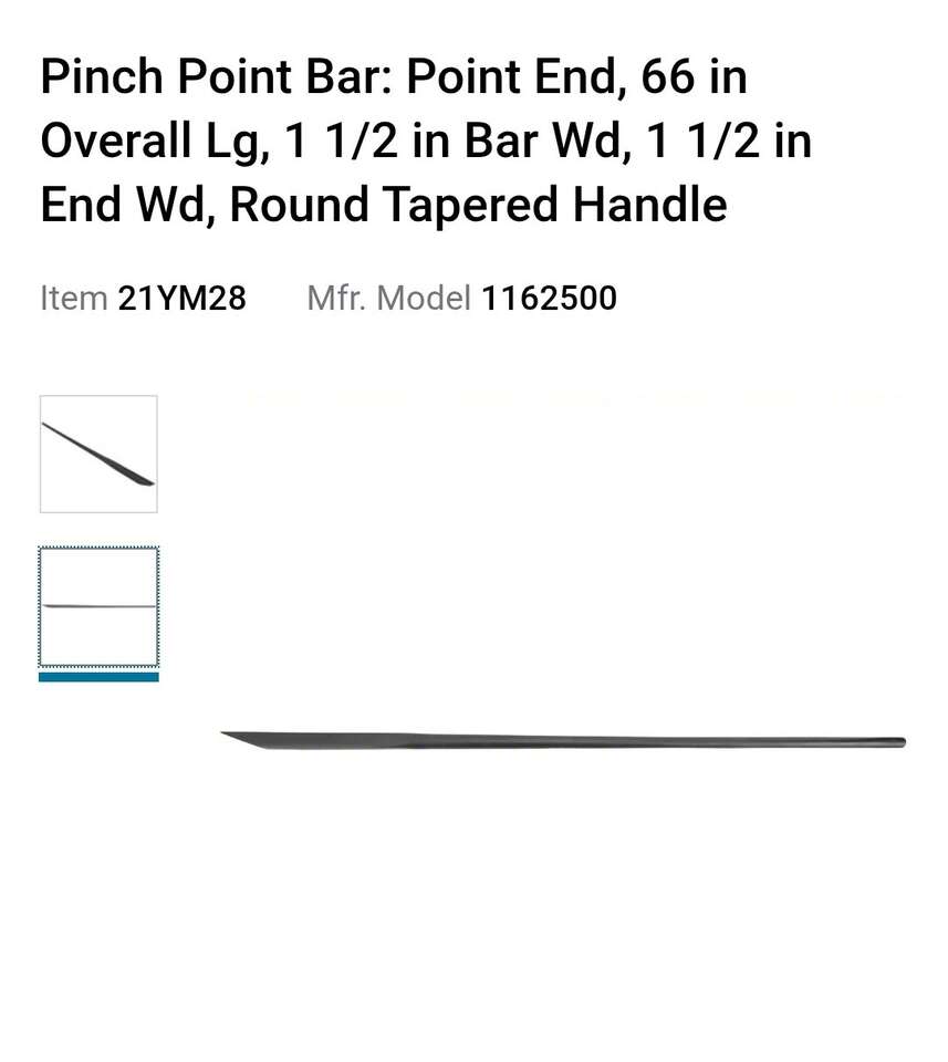 Product Description The wedge-shaped tip of pinch bars pries apart joined materials and lifts heavy objects. On the opposite end of the bar is another wedge-shaped tip or a different end style to perform other prying applications. Also known as pinch-point crowbars, they are commonly used to open crates and move parts or materials in construction, ironworking, and maintenance tasks. Brand: TRUE TEMPER Features: Round Tapered Handle Overall Length: 66 in Bar Width: 1-1/2 in End Width: 1-1/2 in End Style: Point End Angle Style: Straight Manufacturer Part Number 1162500