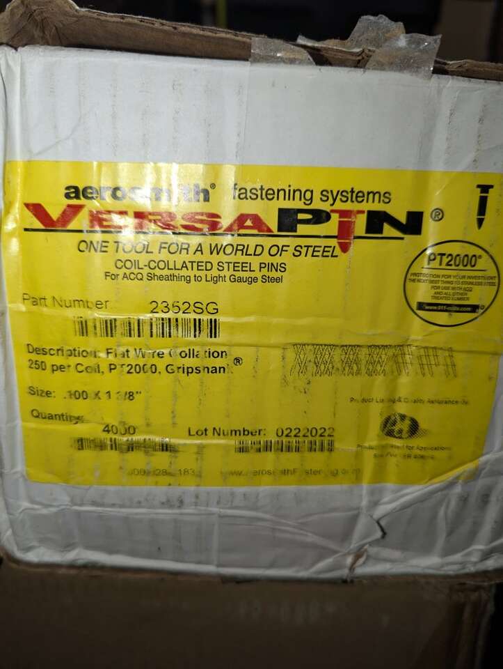 GooglePayBrand New. In the box. Several boxes available. Discounts available for purchasing multiple boxes. Aerosmith Fastening Systems 2352SG .100 x 1-3/8" Gripshank® PT2000 Galvanized Coating VersaPin® Ballistic Point Coil Collated Pins (4,000/Box)Benefits of VersaPin® Fasteners: