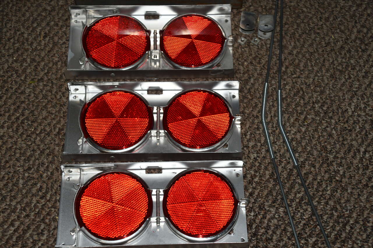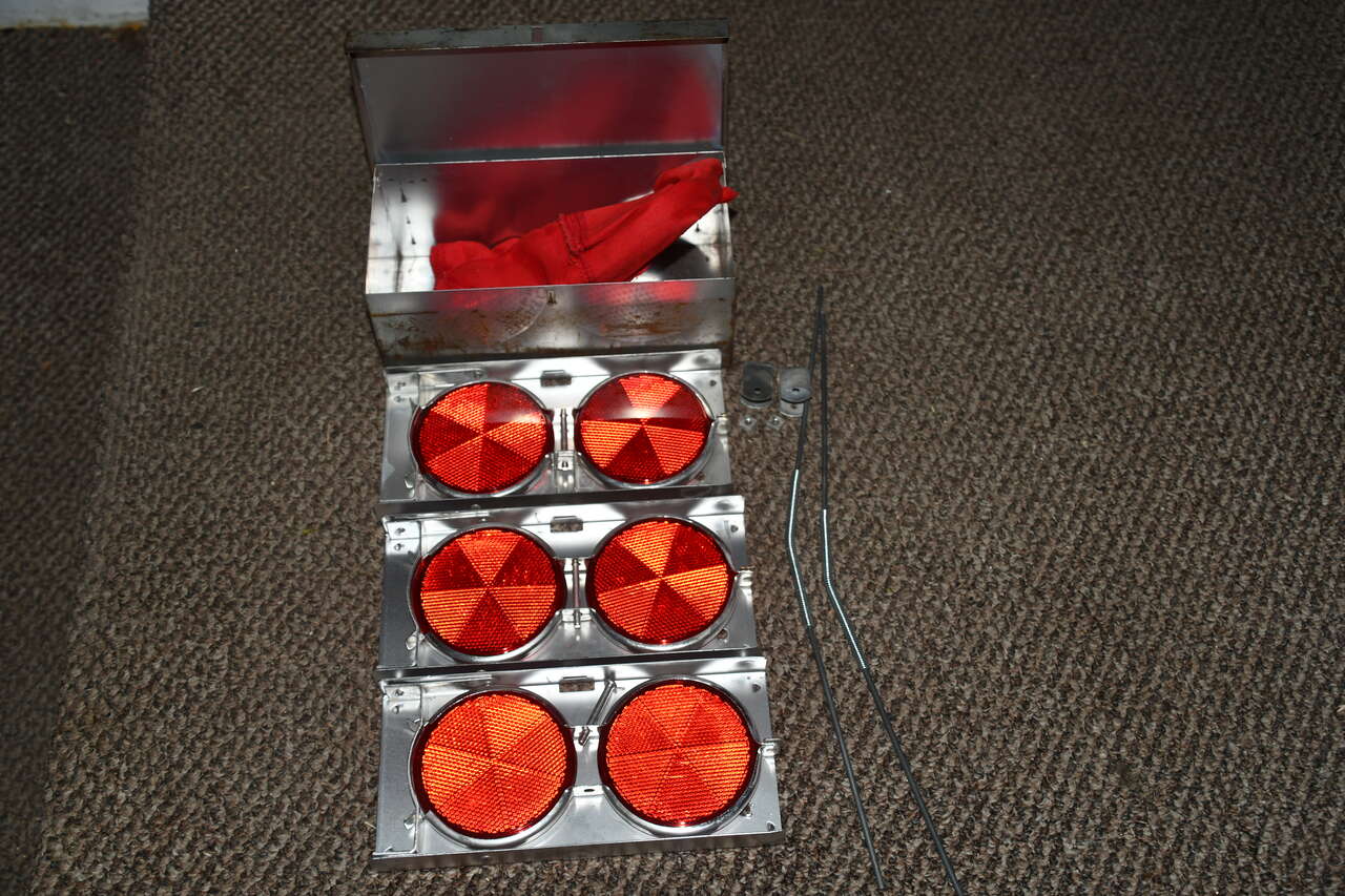 Vintage Stratolite Road Flare Reflector Set with original metal storage case. They were a roadside emergencies signaling devise before newer hazard lights were made. There are 3 duel Stratolite lenses that have a distinct industrial look. The reflectors were designed to face oncoming traffic, warning them of hazards. They were most likely never used but the metal box has wear. Cash only in Plain City for this Vintage rare to find set.