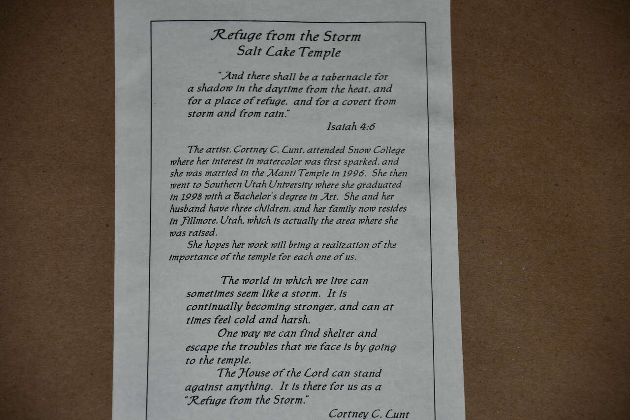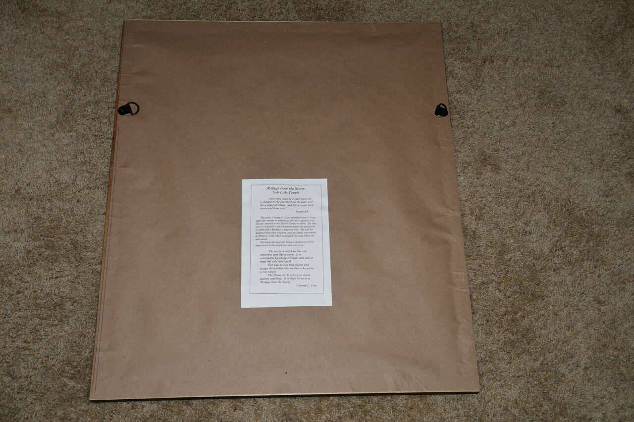 This SALT LAKE TEMPLE "REFUGE FROM THE STORM" PICTURE is about 22" x 26" FRAMED. Our home is smoke free. Questions??? Please ask. We are located in Plain City. Cash only please.