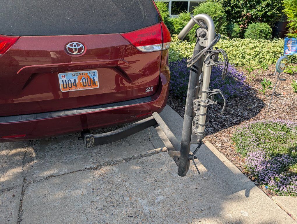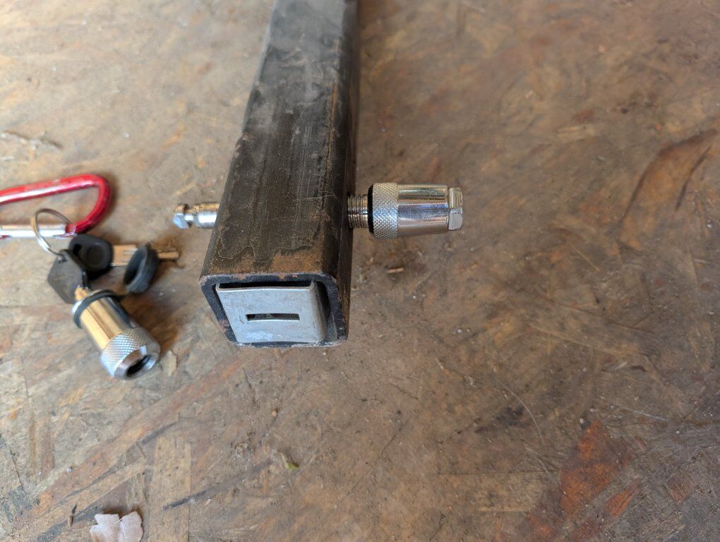 Giant brand. swings away for rear access. works great! comes with no sway locking hitch bolt and cable lock and keys. fits 2 inch hitch receiver.