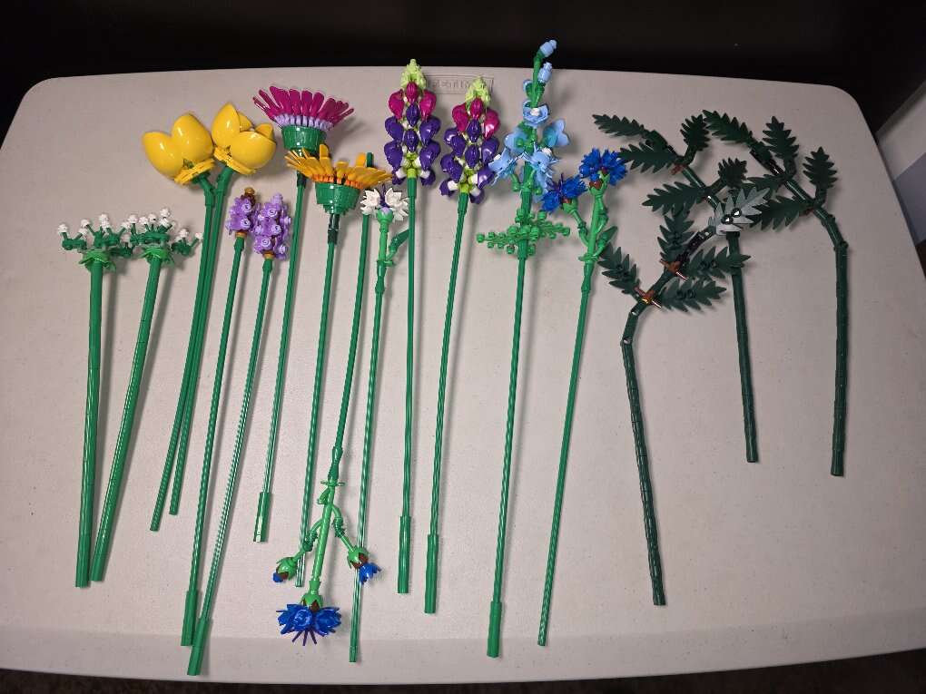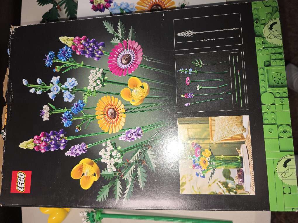 Pre-Owned LEGO Botanicals Artificial Wildflower Bouquet 98% Completed. missing one flower and a leaf on the piece is upside down on photo.